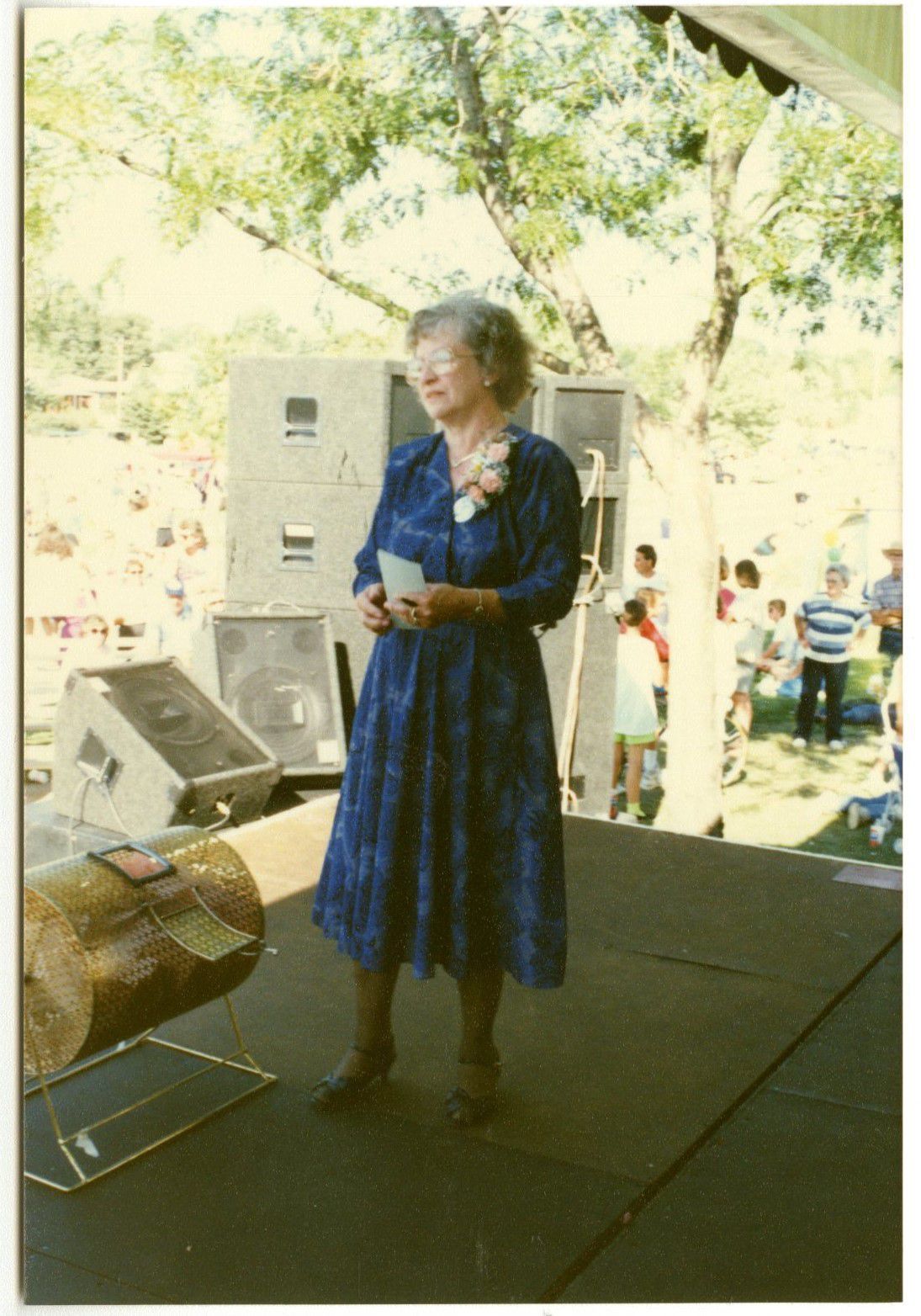 Item is a colored photograph taken during the 1990 Broomfield Days event. The photo centers around an elderly woman standing on a makeshift stage with speakers and equipment behind her. She wears black heels and a blue dress with flowers pinned to it and holds a card in her hand, which she has likely just drawn from the rusty raffle drum on the floor in front of her. She is about to read the name of the raffle winner. Behind her, a large tree takes up most of the background, as well as a group of people standing around the stage, chatting with each other and waiting to hear the announcement.Photograph Details