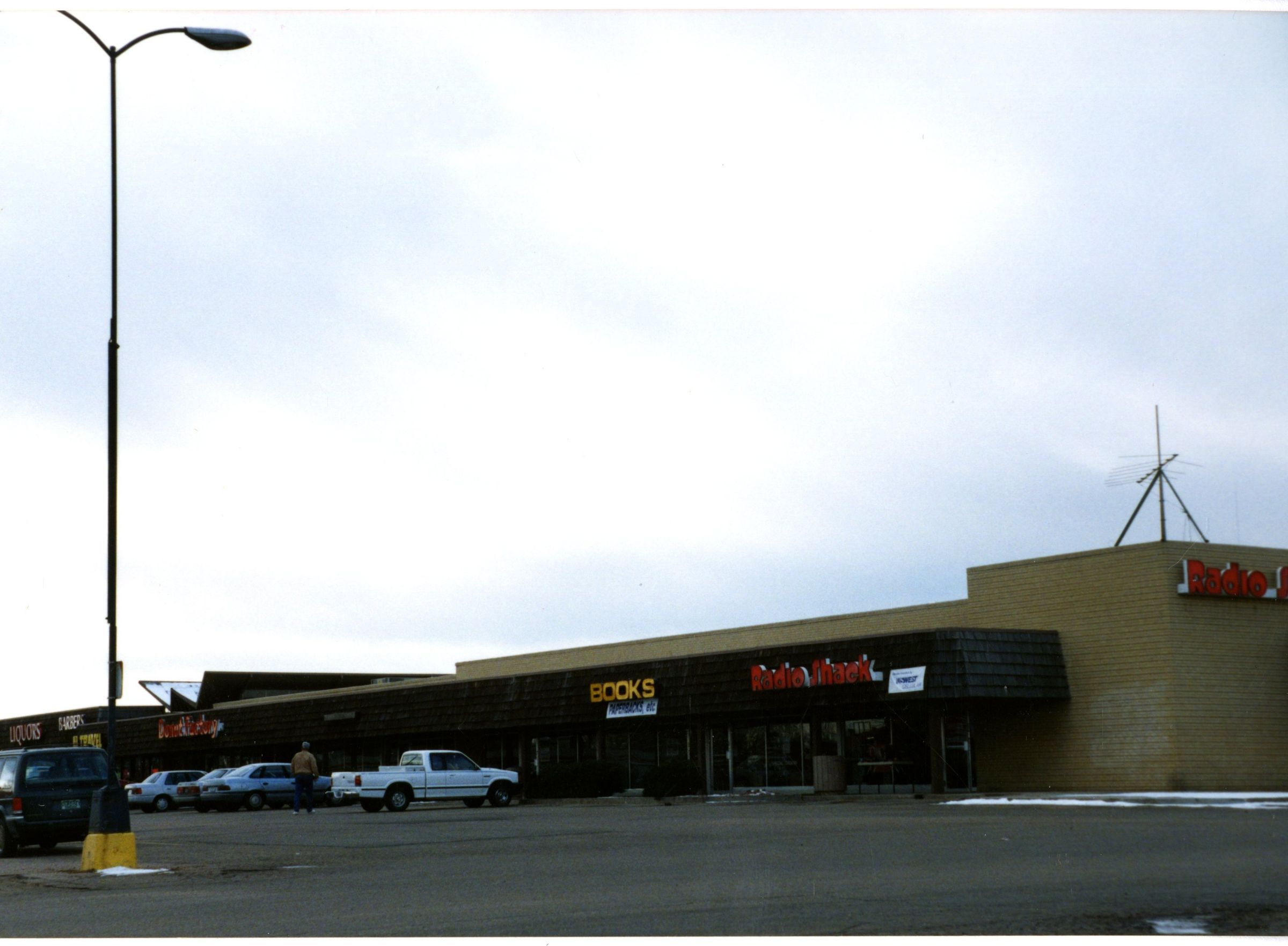 This Photo was taken across the parking lot on the East side looking S.W. The Businesses featured are Radio Shack, Books, Donut Factory, Travel Barbers, and Liquors. Original shopping / strip mall built in 1957 at the intersection of Midway, 287, and 36.Collection