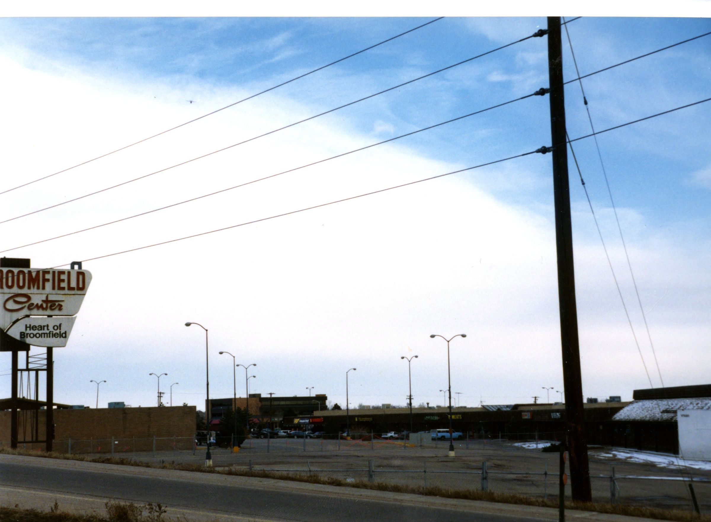 This photo was taken across the street looking N.E. at the Heart of Broomfield sign. The businesses that are featured in this are Miller Genuine Draft, Junque's, Humphrey's, Optical, Meats, Majestic Cleaners and Dirty Laundry, and Fashions. Original shopping / strip mall built in 1957 at the intersection of Midway, 287, and 36. Photo likely taken shortly before the shopping center was demolished and replaced in 1994 with a Target.Collection