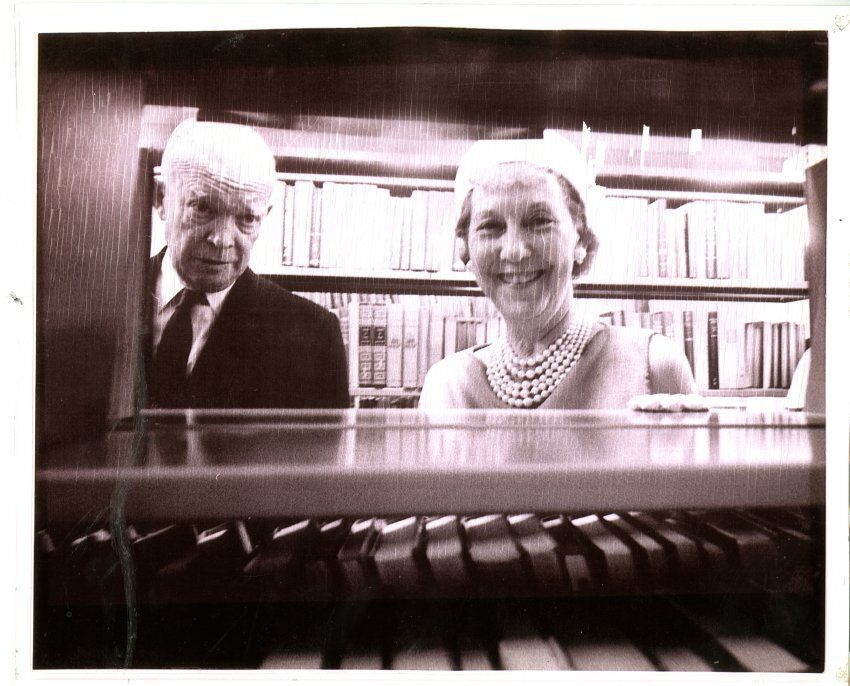 Mamie Doud Eisenhower and Dwight D. Eisenhower looking through the bookshelves of the Mamie Doud Eisenhower library at 12 Garden Center on its dedication day.