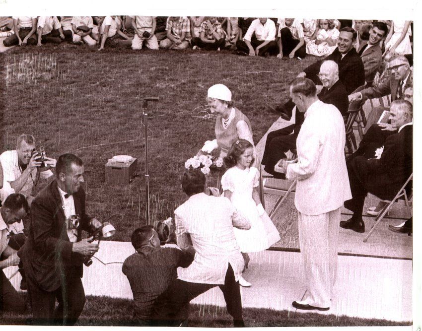 Mamie Doud Eisenhower at the dedication of Broomfield's first library at 12 Garden Center. Mamie was handed a bouquet of carnations (donated by the Broomfield Business and Professional Woman’s Club) by 8-year old Maureen Cronin of 280 Kohl Street. Dwight Eisenhower is visible to the right (seated in a dark suit).