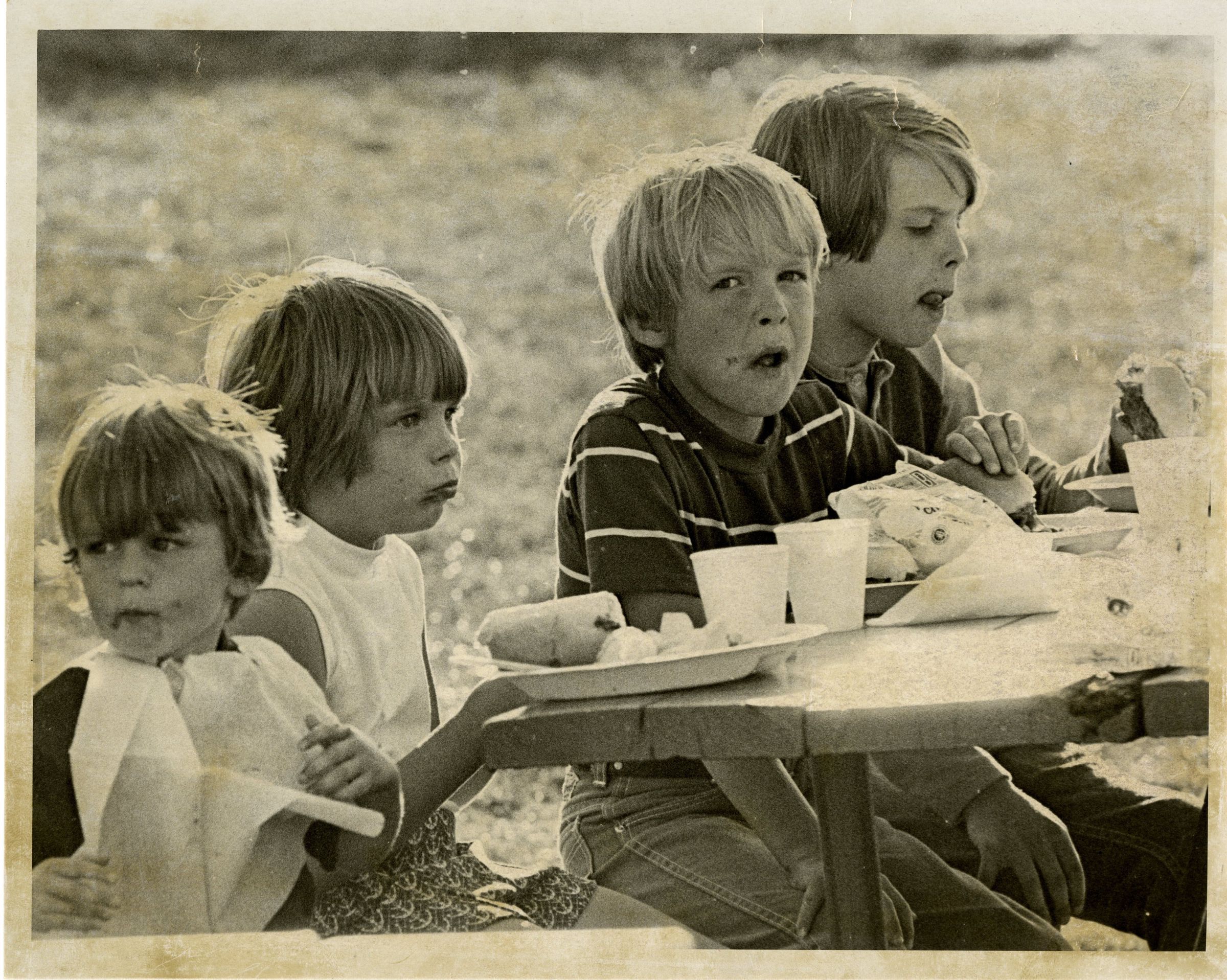 Four children eating at a table outside. Photo is in black and white.