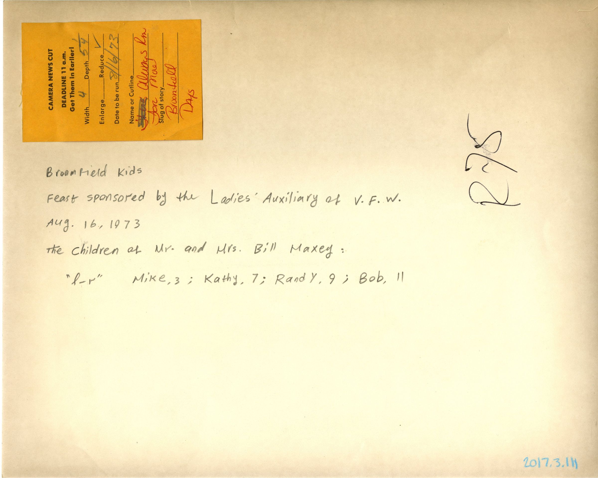 Broomfield Kids - Feast Sponsored by the Ladies' Auxiliary at V.F.W.Entry/Object ID