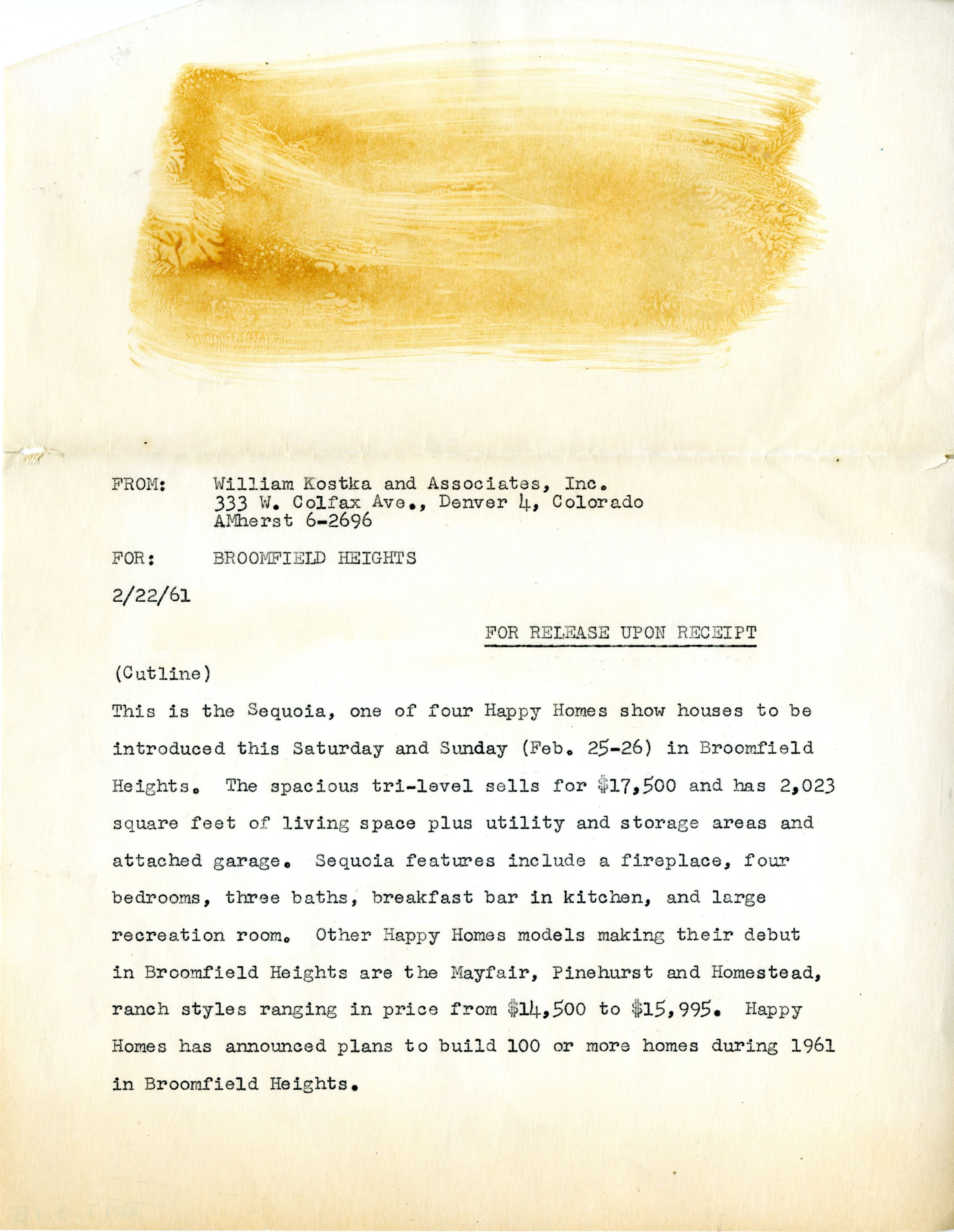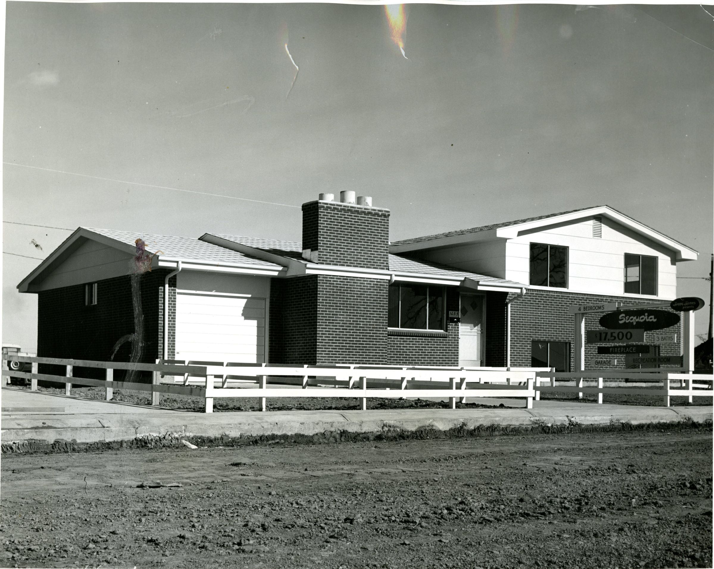 Photo of the Sequoia model house in the Broomfield Heights. In the yard is a sign that advertises the model of the house. the fact that the house has a fireplace, four bedrooms, three baths, a garage, a Recreation Room and that the house costs $17,500