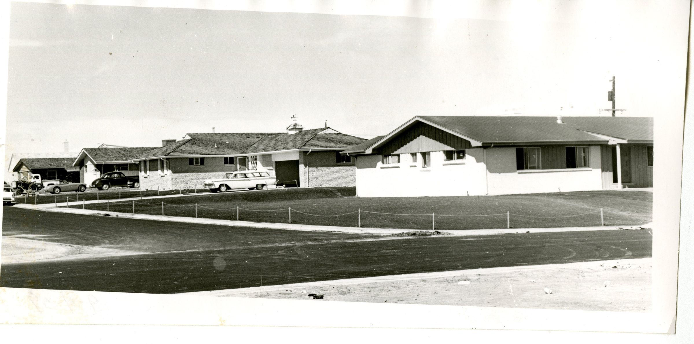 This photo is of the "Parade of Homes" on W. 6th Avenue where fourteen new homes were displayed for people to come and view in Broomfield Heights. A tiny article is glued to the back sharing the same information as above.