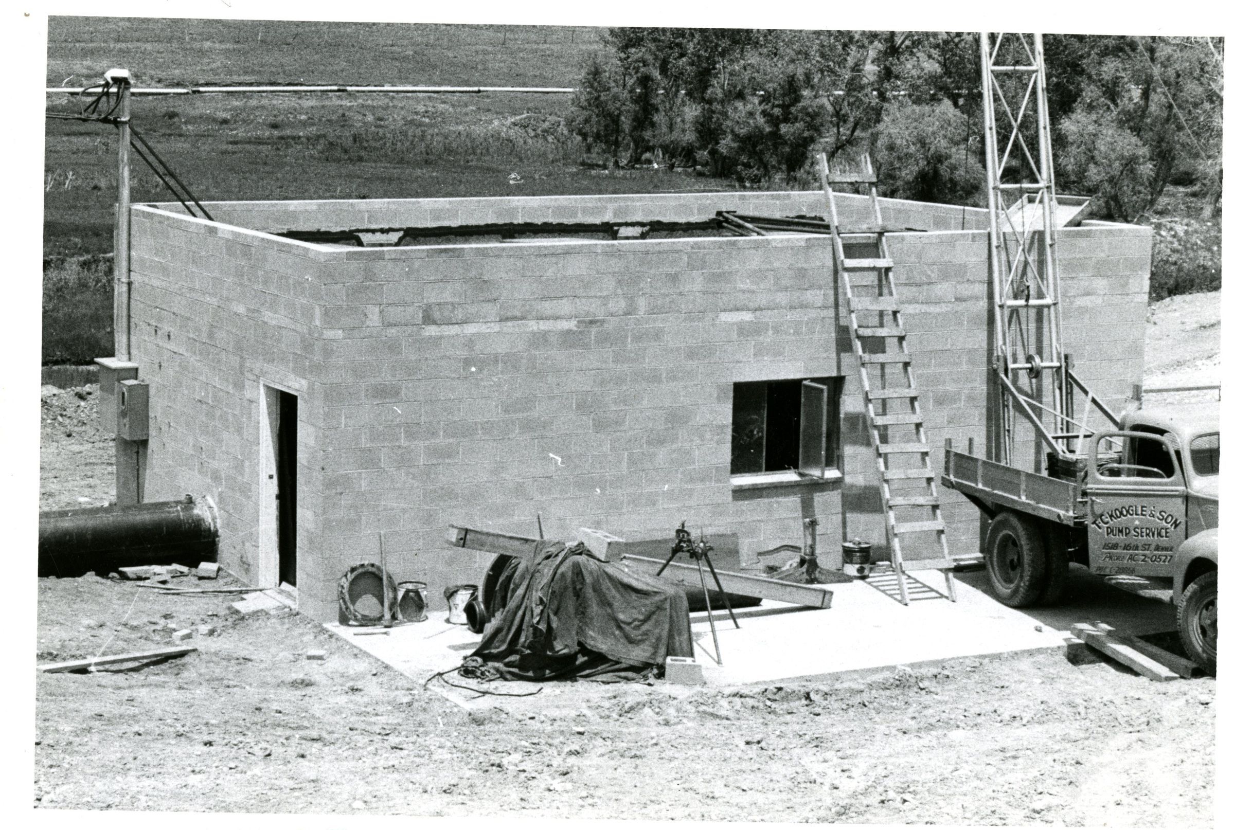 This is a Photo of a concrete block building (relating to filling a lake?). There is a truck in front of it that says "T.C. Koogle & Son Pump Service".