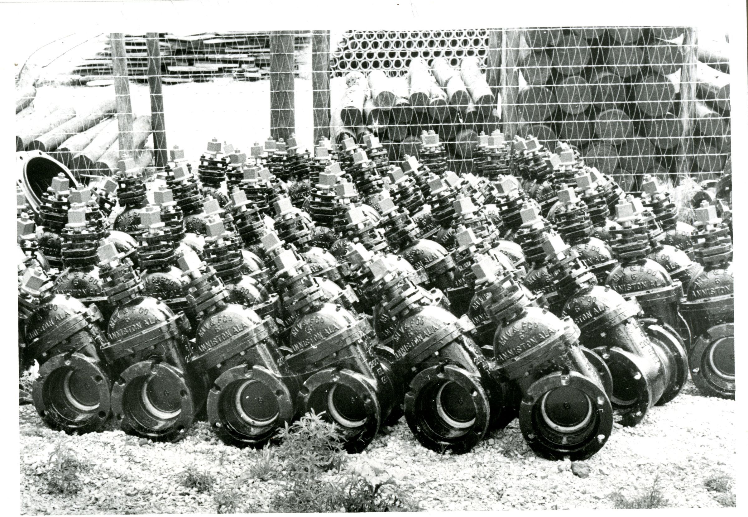 Photo of rows of unknown cylinder machinary parts laying on the ground by a chain link fence, possibly for pumping or electrical. Possibly equiptment for Broomfield Heights infrastructure, based on the date.