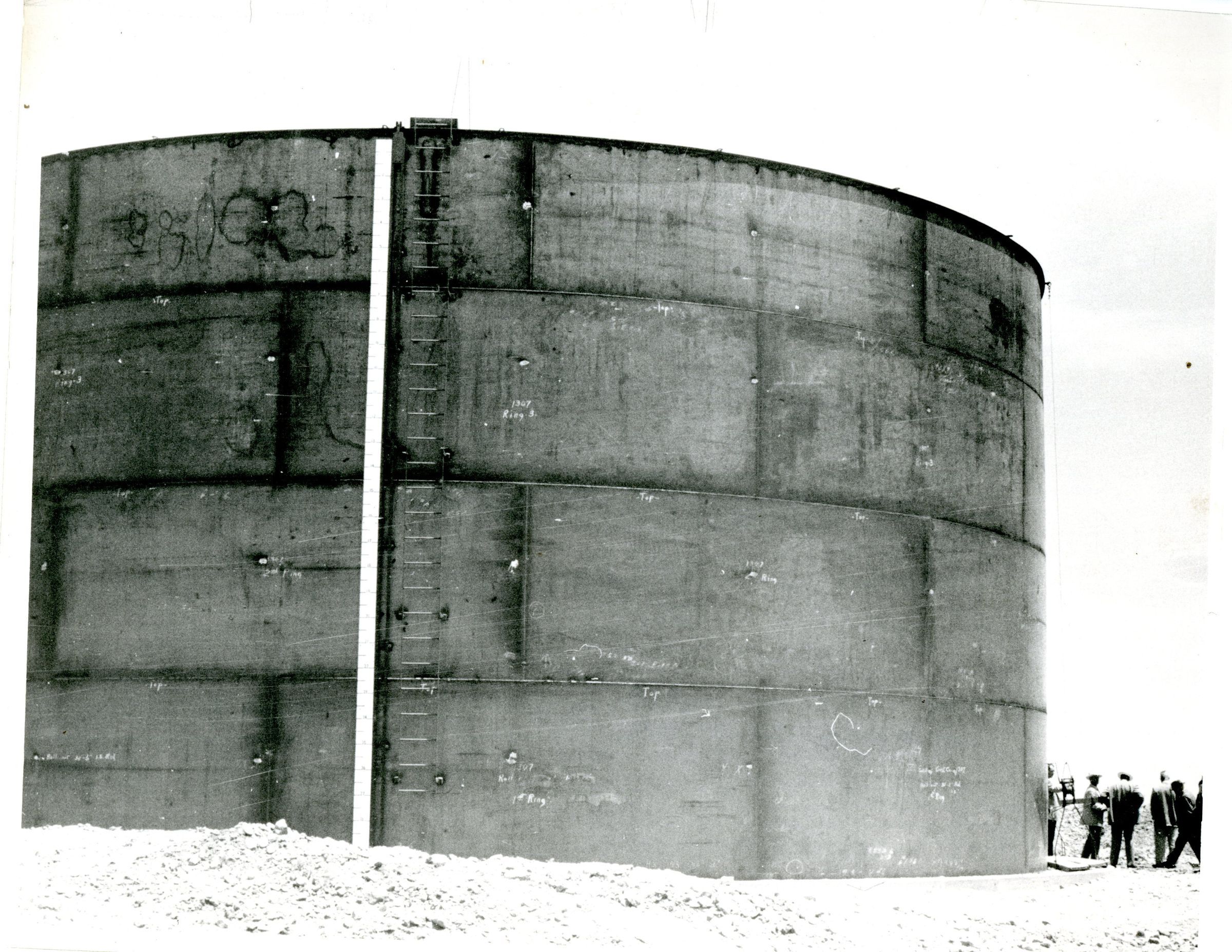 In this photo is a a building in the shape of a huge cylinder. Men have their backs to the camera in the bottom right corner. On the pressure tank you can see small bars going hortizontally up the the tank this is the ladder. Possibly the new water tank to serve Broomfield Heights in the 1950's.