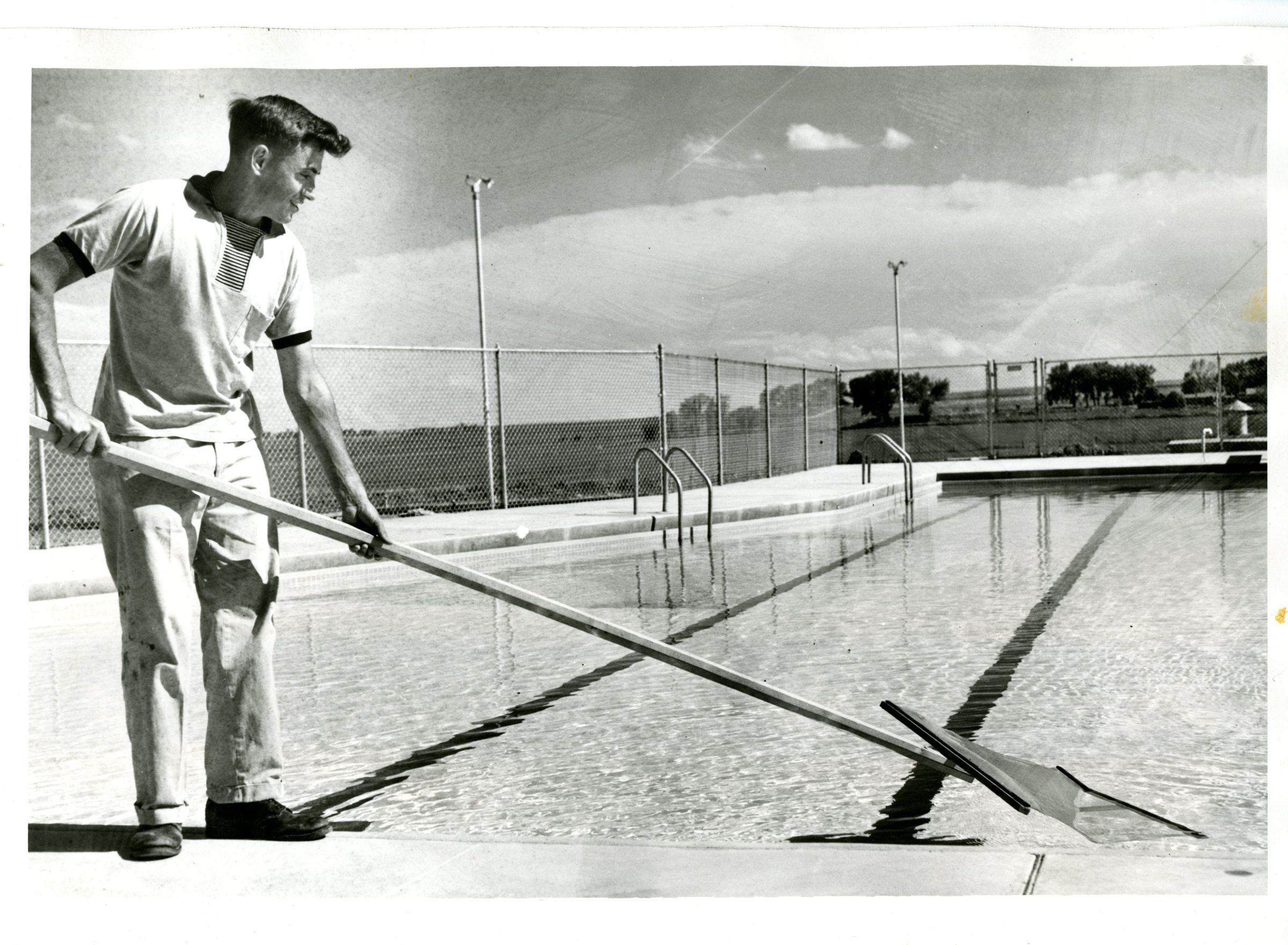 In this photo a lifeguard Chuck Robinson cleans the pool to make sure it's ready for opening day of the Broomfield Municipal Swimming pool.