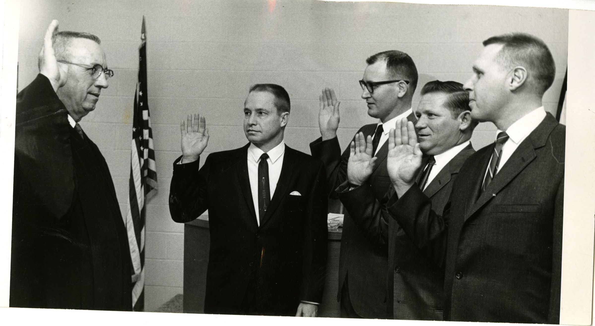 Broomfield city council, oath administered. Pictured Wm. E. Buck, Clyde A. Brunner, Darrell Touts (?), George Hall, Glen Peterson. Black and White