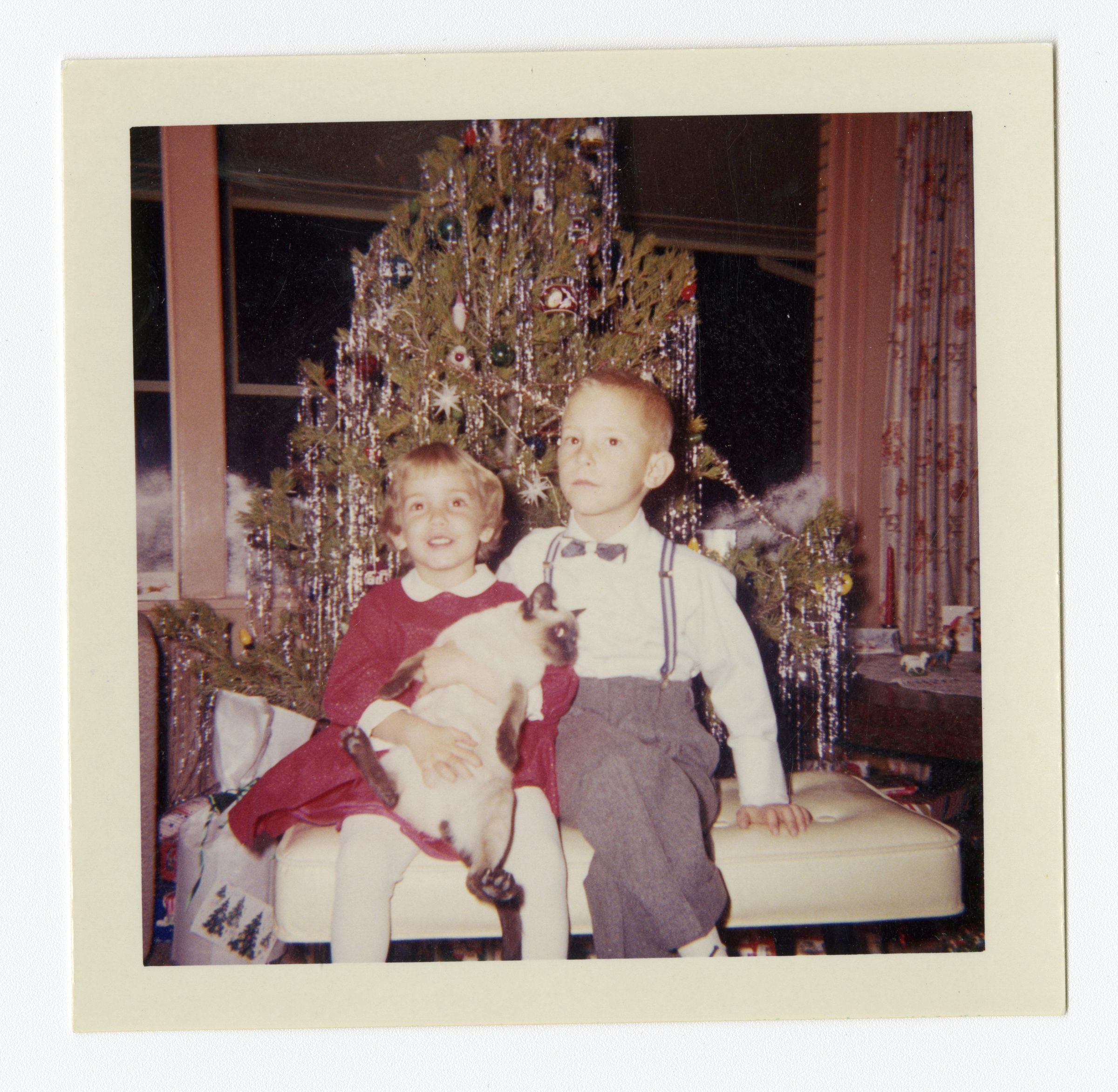 Color photograph of two children in front of a Christmas tree. The child on the left is holding a cat. The children are possibly Lisa and David (kids of Carrie and Clyde).