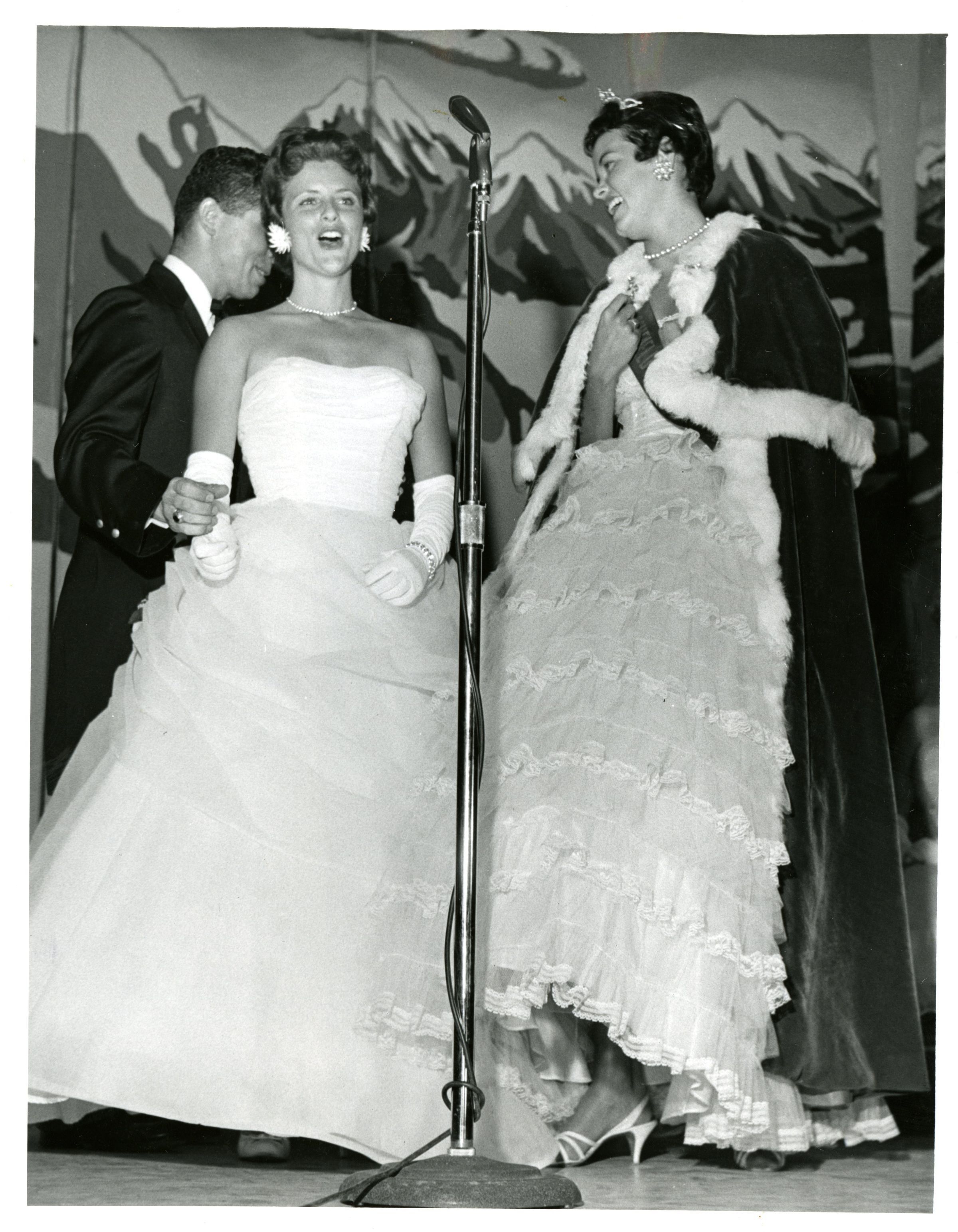 black and white photo of two woman dressed in gowns, unidentified man on left. Betty Nasambene (left), 18, of Denver winner of Broomfield Heights beauty contest and Marianne McDonald, (right), last year's winner. Miss Colorado contest and Miss America pageant.