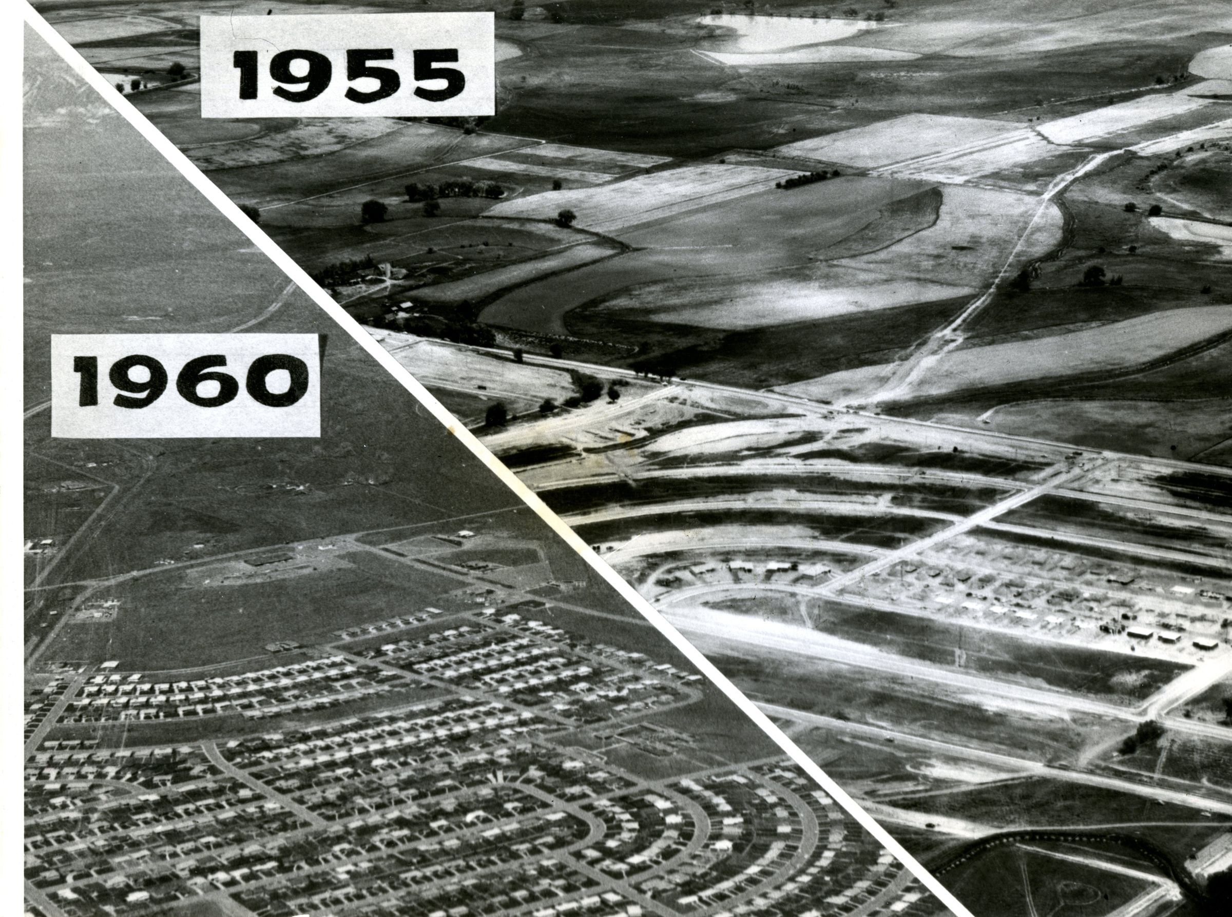 Black and white photo. Two aerial pictures of Broomfield Heights, one dated 1955 the other 1960 showing the development.