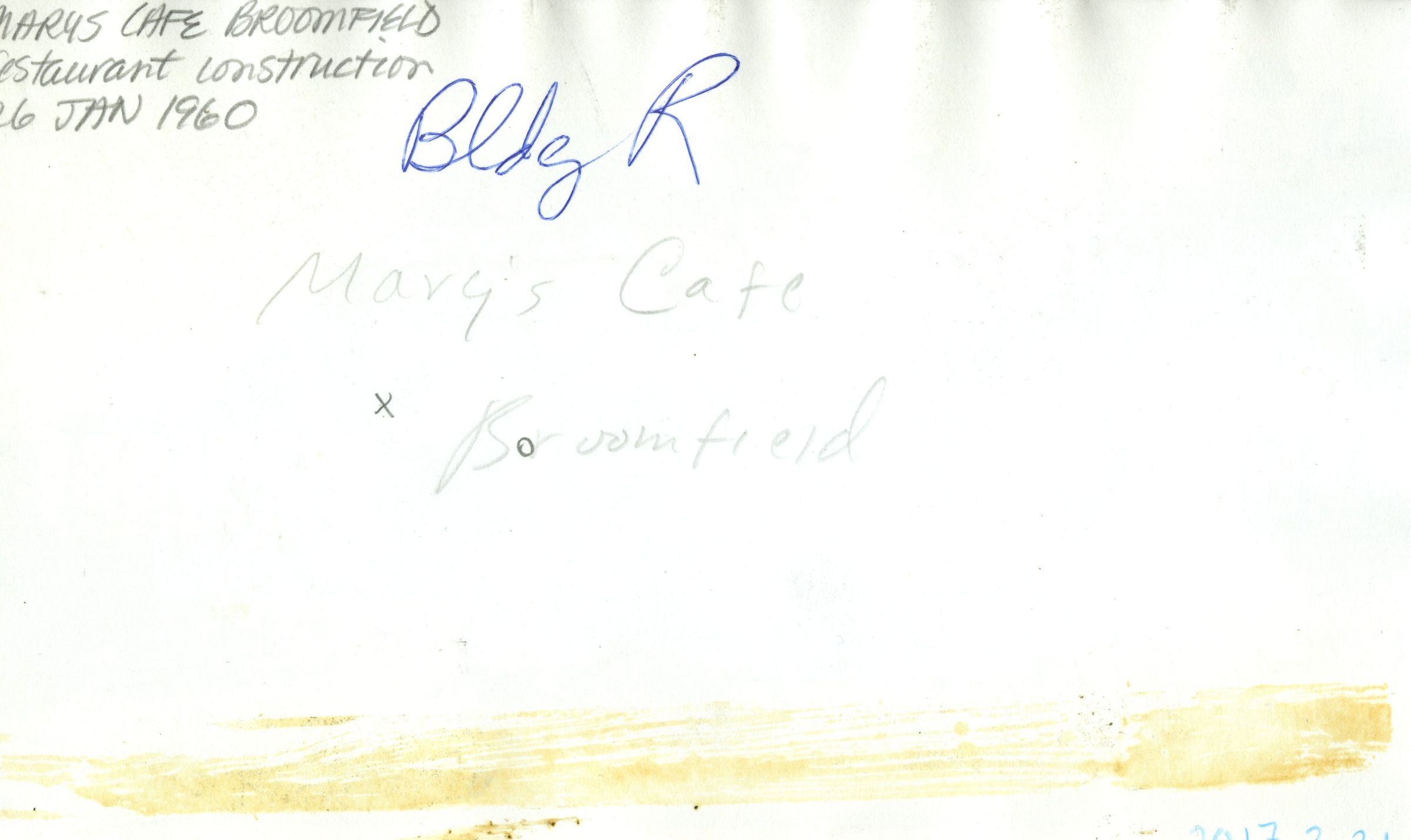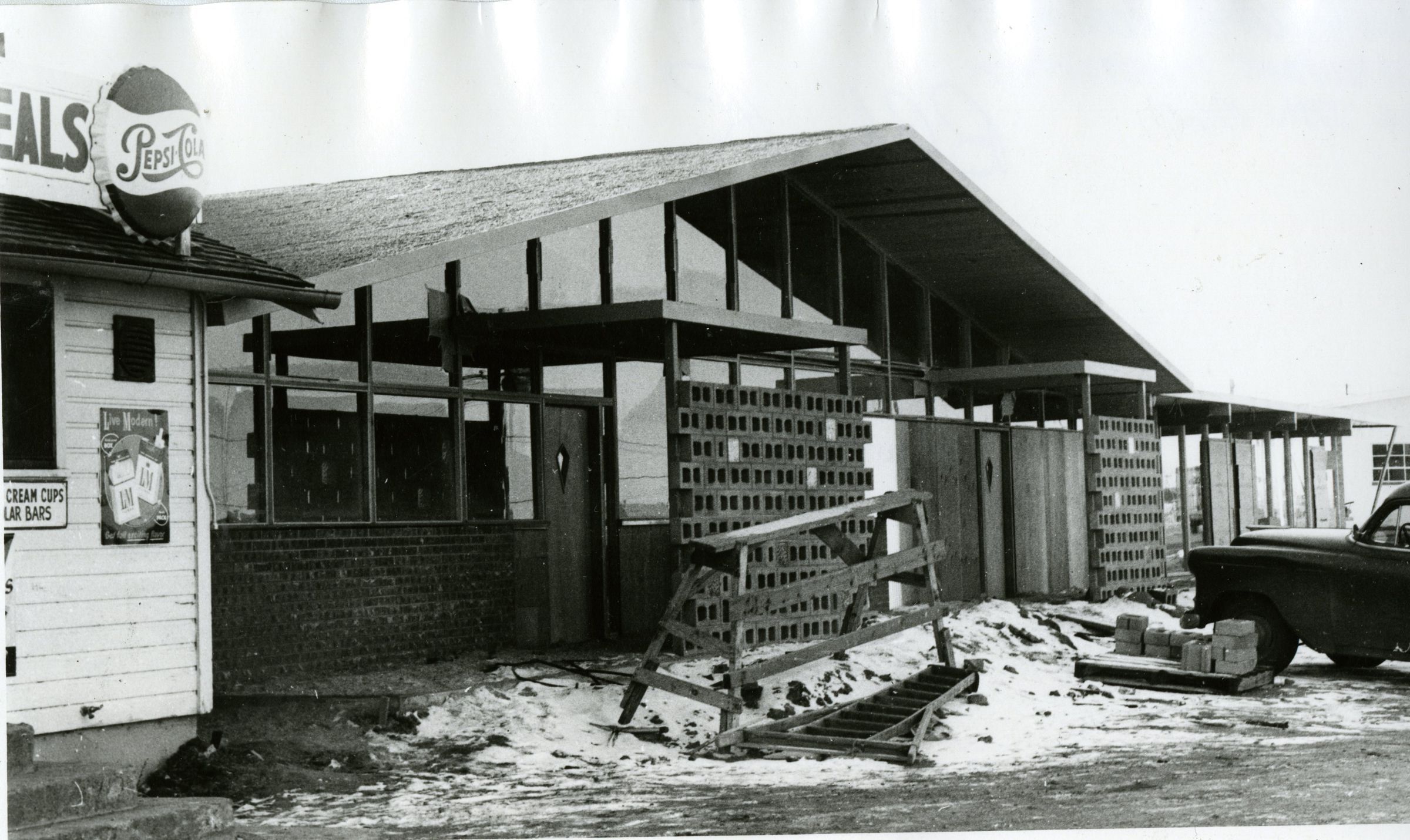 Black and white photo of restaurant construction of Mary's Cafe. Partially completed building with Pepsi Cola and L & M cigarette signs. Old car in front. According to old newspapers, Mary's Cafe was located on 287.