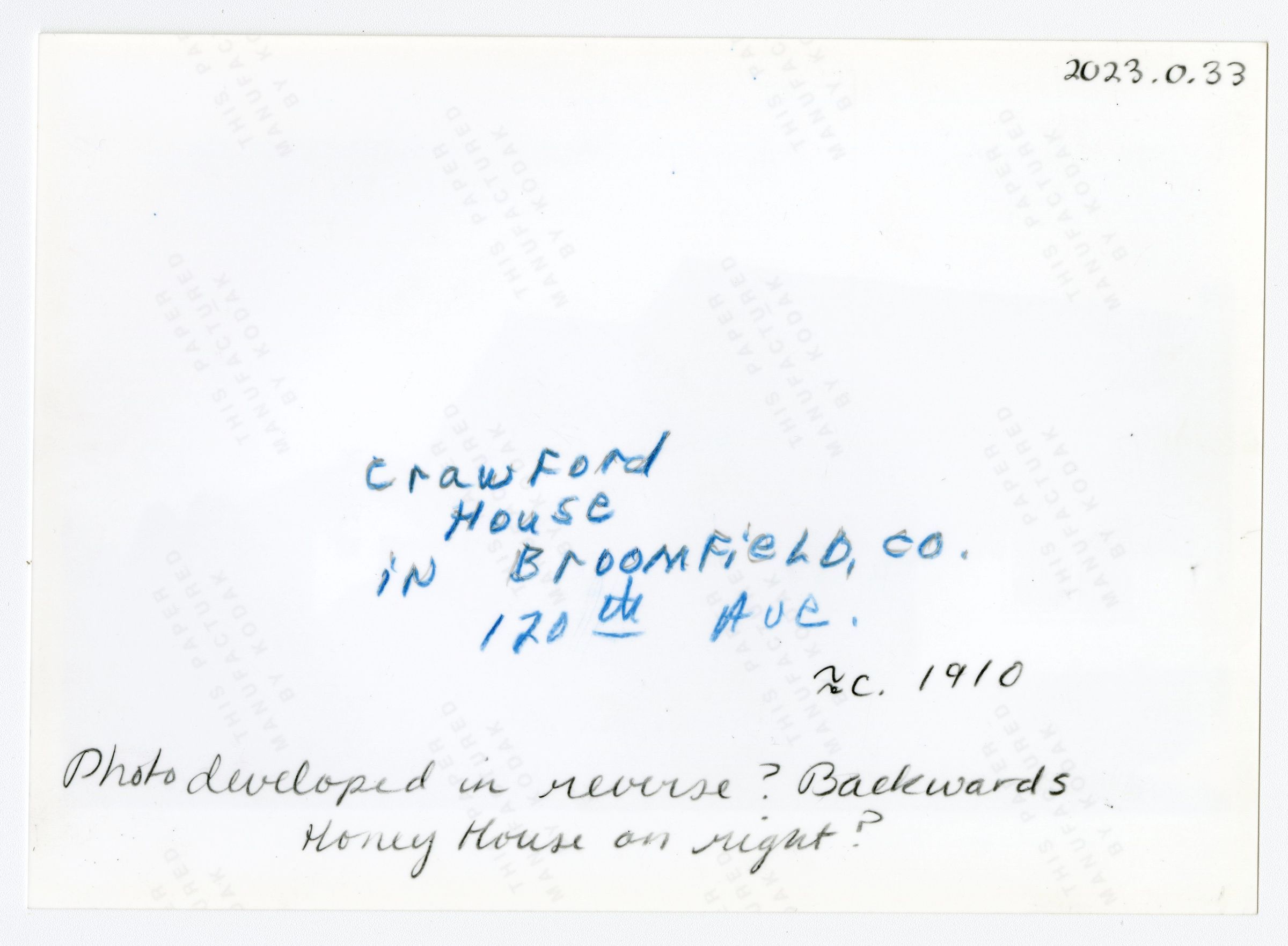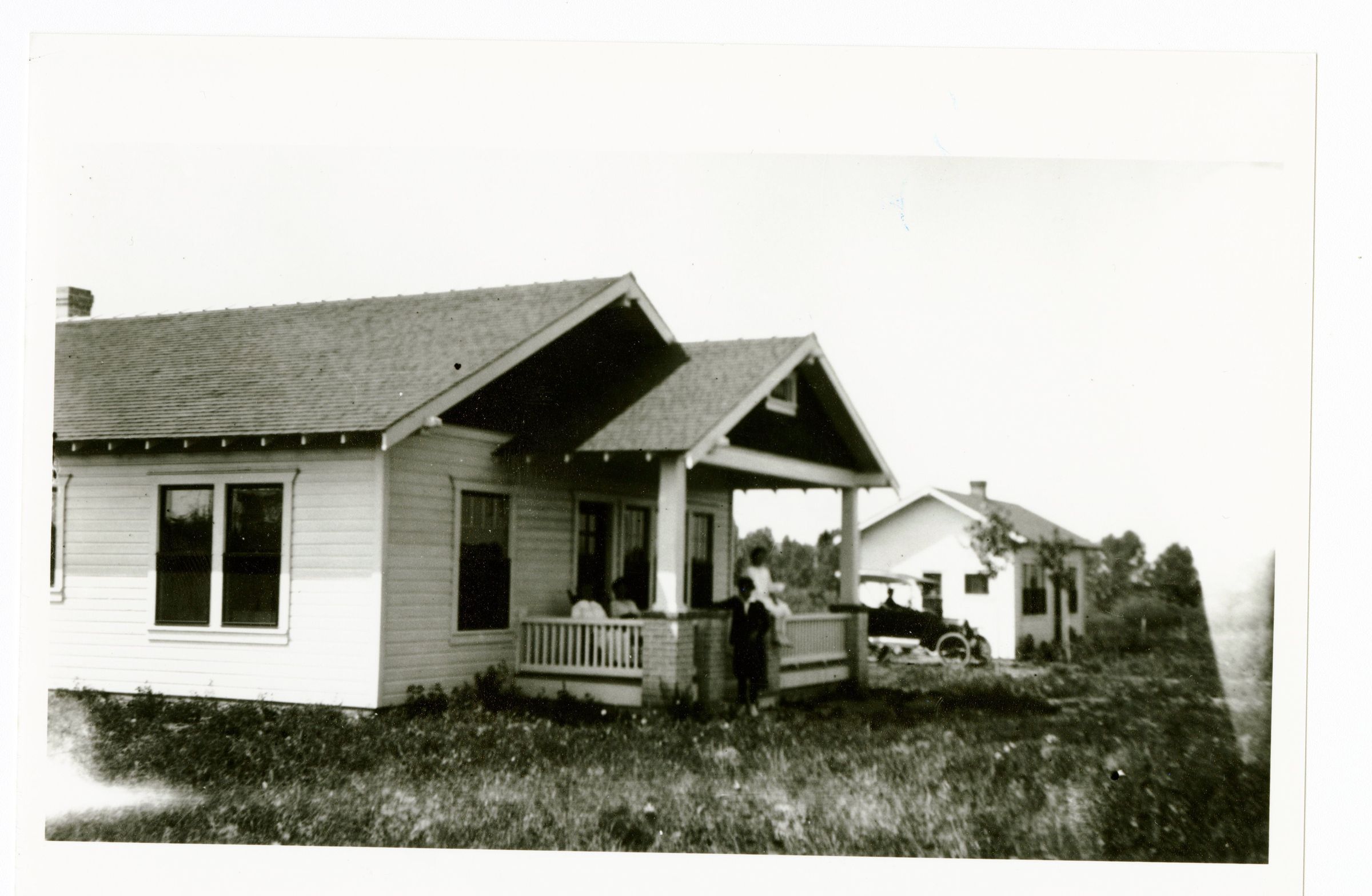 Black and white photo of the Crawford House, with Honey House at left and a vehicle parked between the two buildings. On the Crawford House porch there are two ladies sitting in the chairs and a female sitting on the porch railing. There is also a man standing in the front of the porch. People are likely members of the Crawford Family. This photo appears to have been developed in reverse/backwards as the Honey House appears on the right side of the house rather then the left as in all other photos.