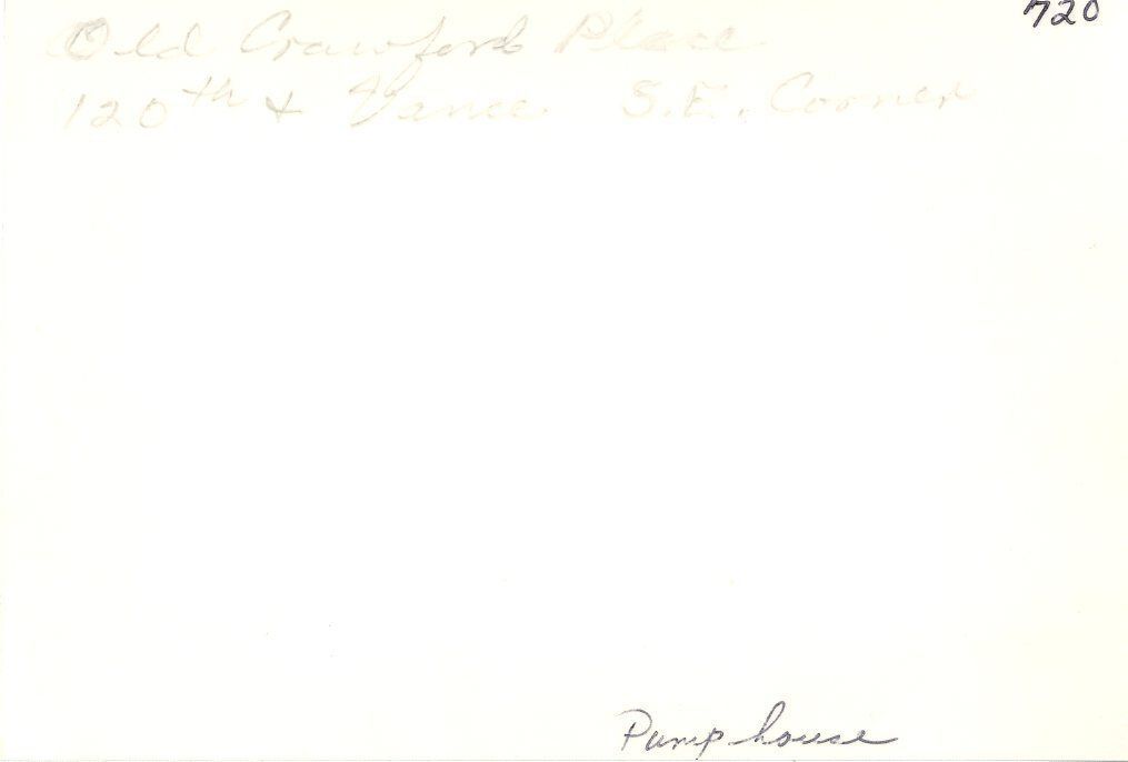 Old Crawford Place. Located at 120th and Vance? on the southeast corner. Shows Honey House and Pumphouse at center.