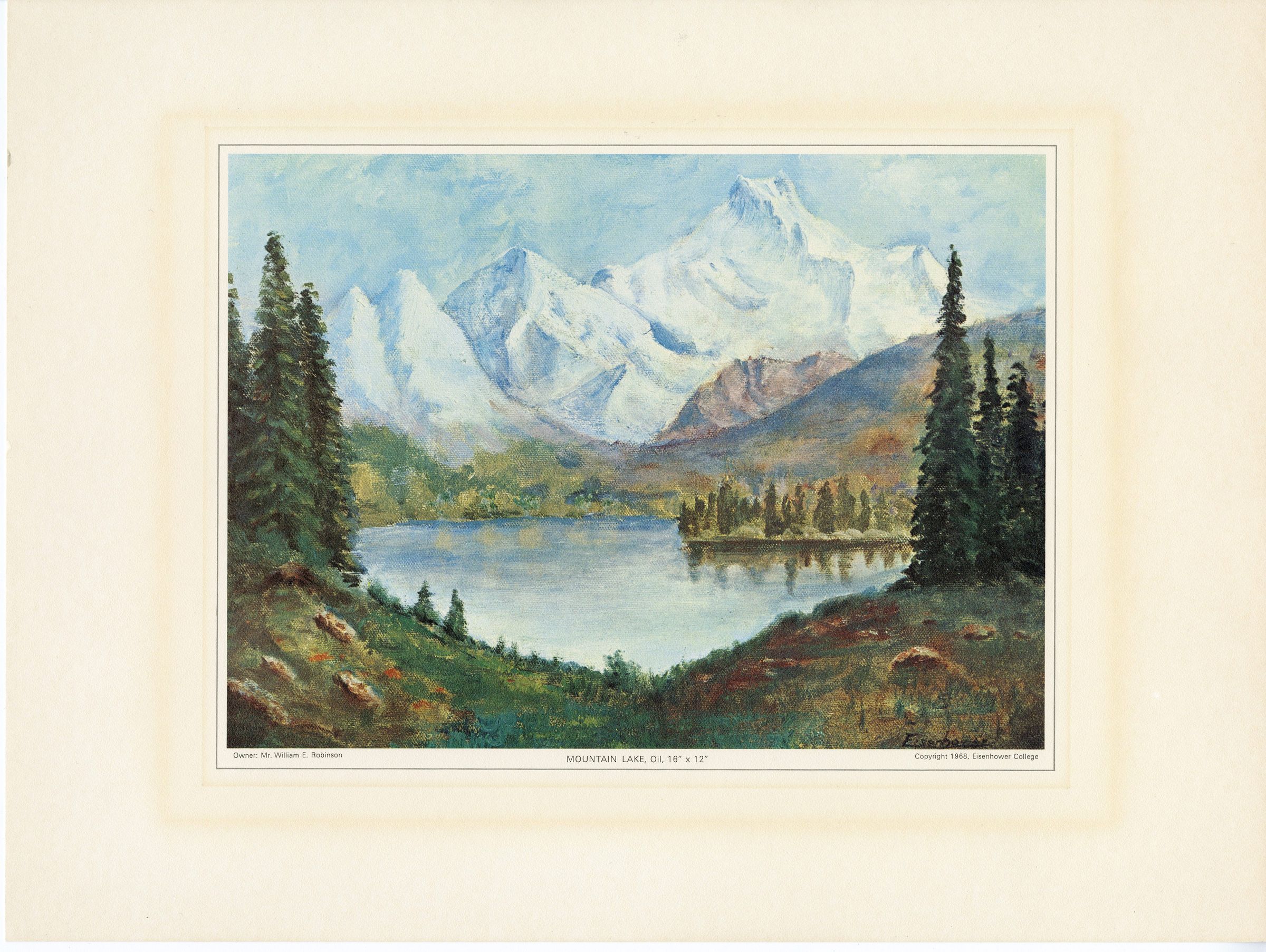 A print of an oil painting by Dwight D. Eisenhower, titled "Mountain Lake". The original painting's dimensions are 16" x 12". Underneath the image, it states that the owner of the painting is William E. Robinson. Depicted is a view of snow-topped mountains in the background, as well as hills. In the midground, there is a large lake. In the foreground, there are rocks and coniferous trees and the artist signature.Artwork Details