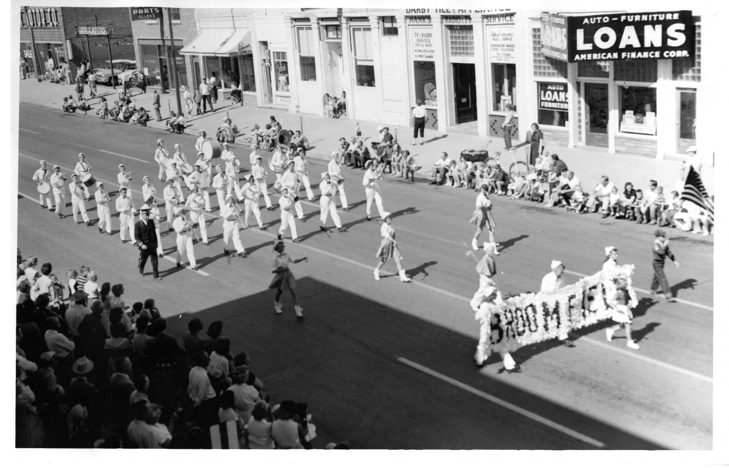 Black and white photo of band marching down a street, sign held reads "Broomfield"