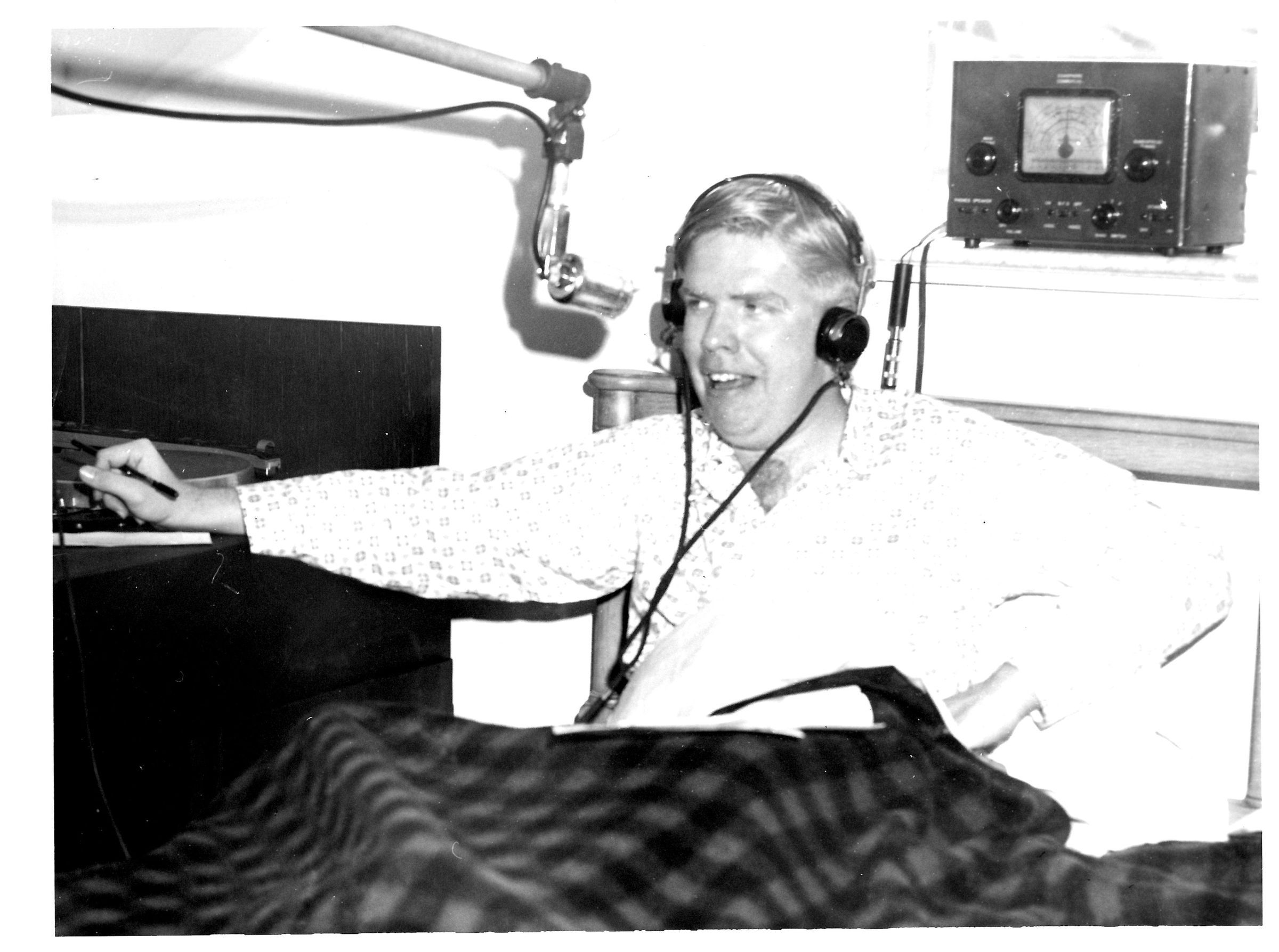 Black and white photo of a man broadcasting in his pajamas from a bed. Radio equipment, microphone, headphones and turntable in picture.