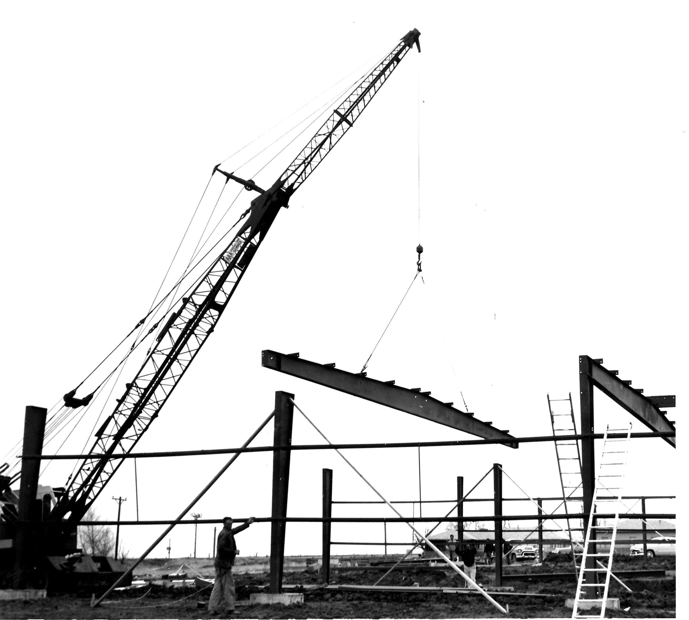 Black and white photo of a building under construction. Crane lifting beans with man pointing. Ladders Possible Garden Center location. Similar to 2017.3.49 photo