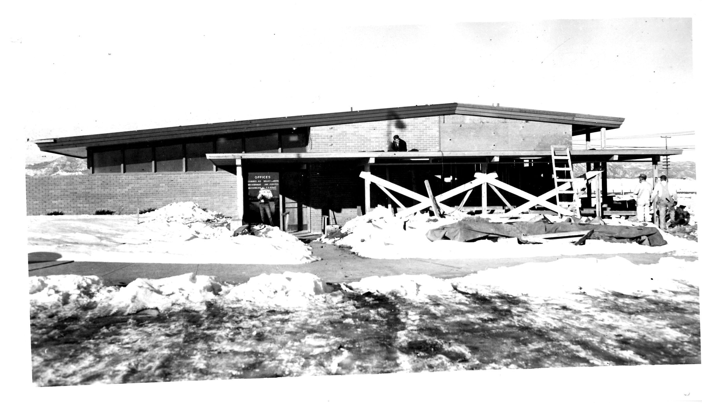 Black and white photo of a building listed as medical facility. Men working on building, ladders and wood supports. Snow on ground Possible Garden Center location, west side bordering Highway 287.