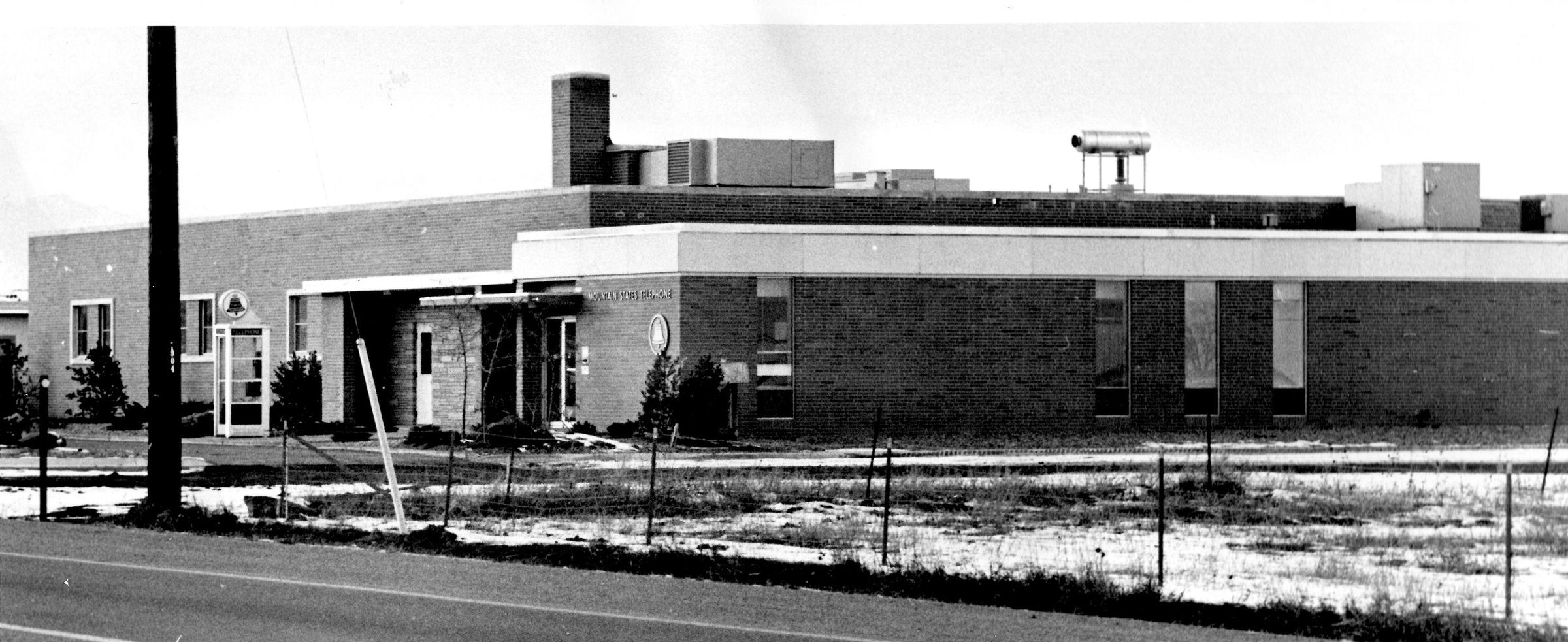 Black and white photo of Mountain States Telephone Exchange Bldg., Back of photo, near Broomfield, $225,000 Blue sticker on back listing Camera News Cut with information, 1/20 date to run Bulding possibly on north west corner of120th and Sheridan