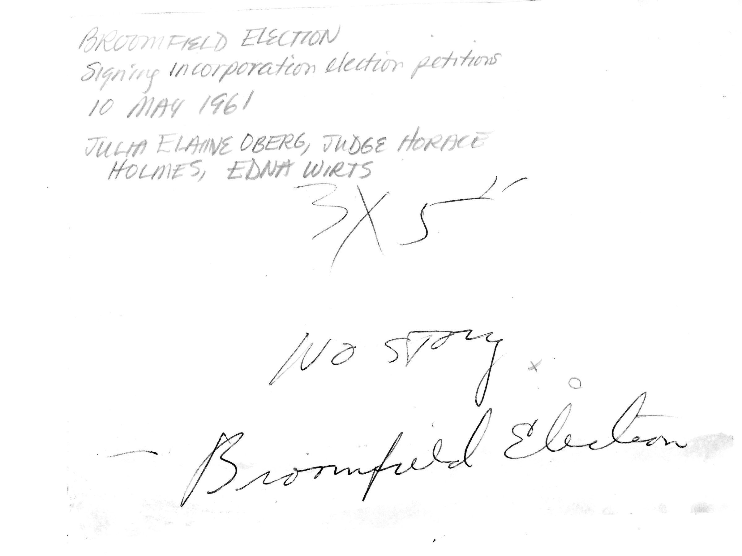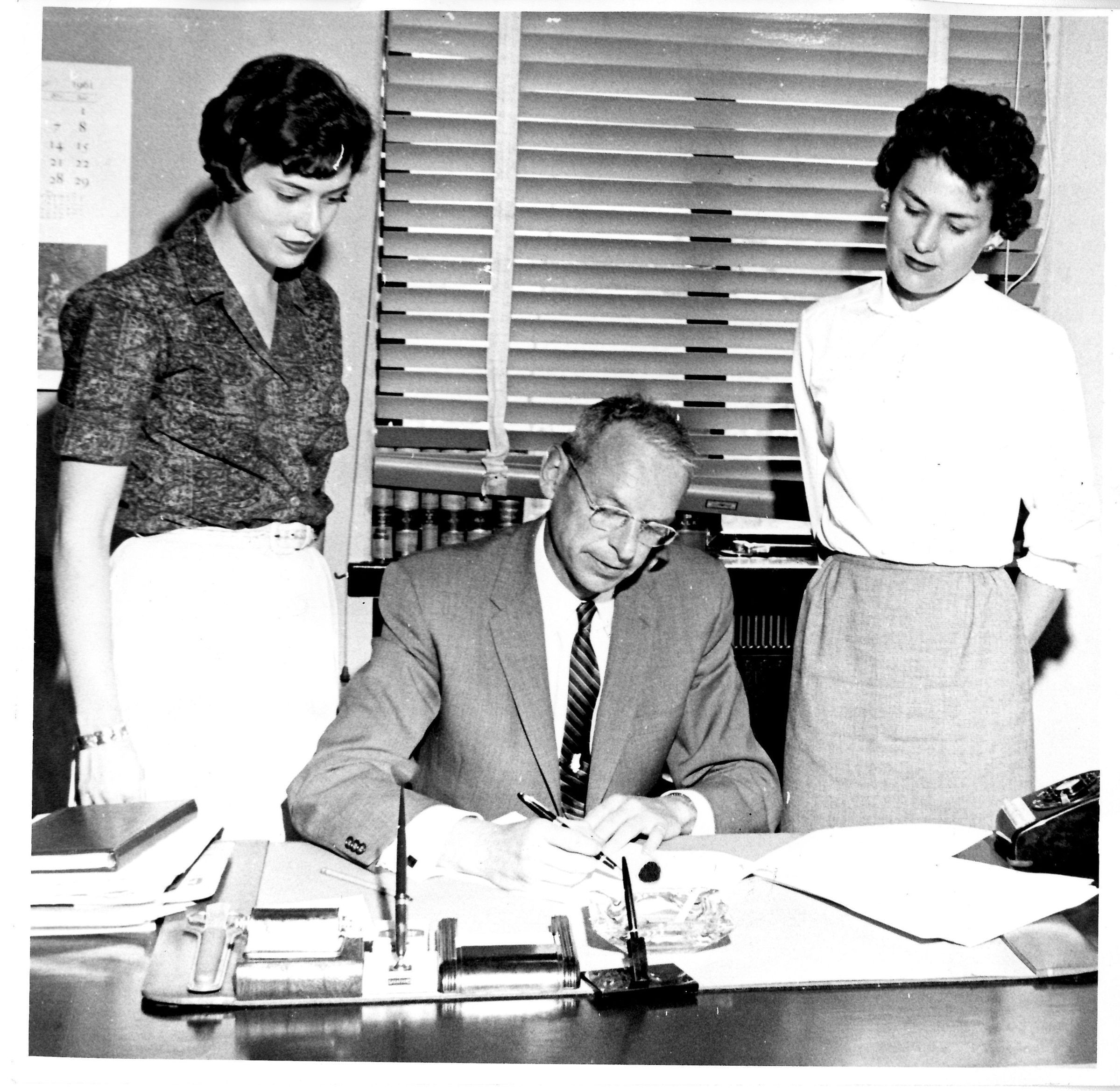 Black and white photo of Judge Horace Holmes, seated at desk, signing incorporation election petitions, with Julia Elaine Oberg standing on his left and Edna Wirts standing on his right looking on.