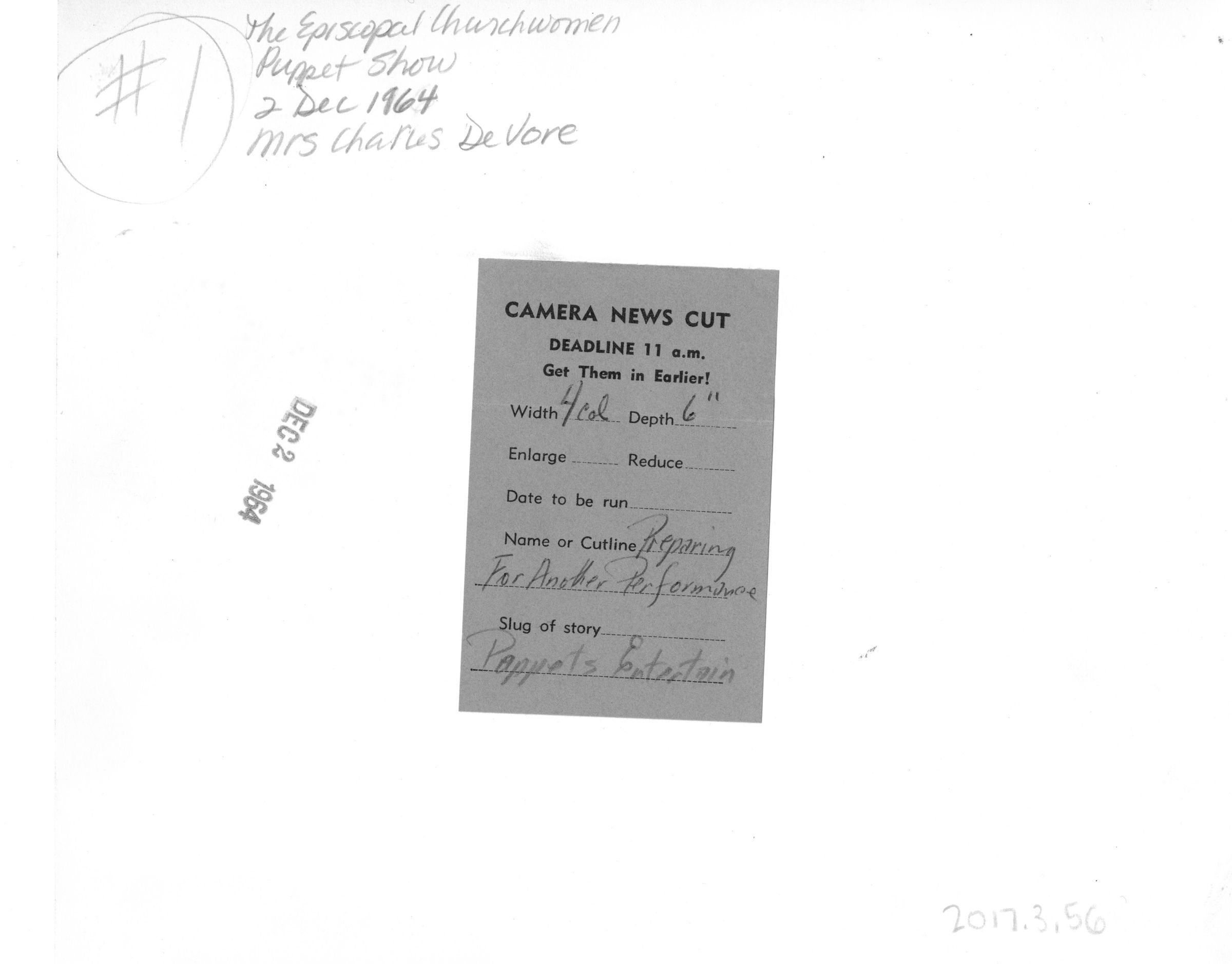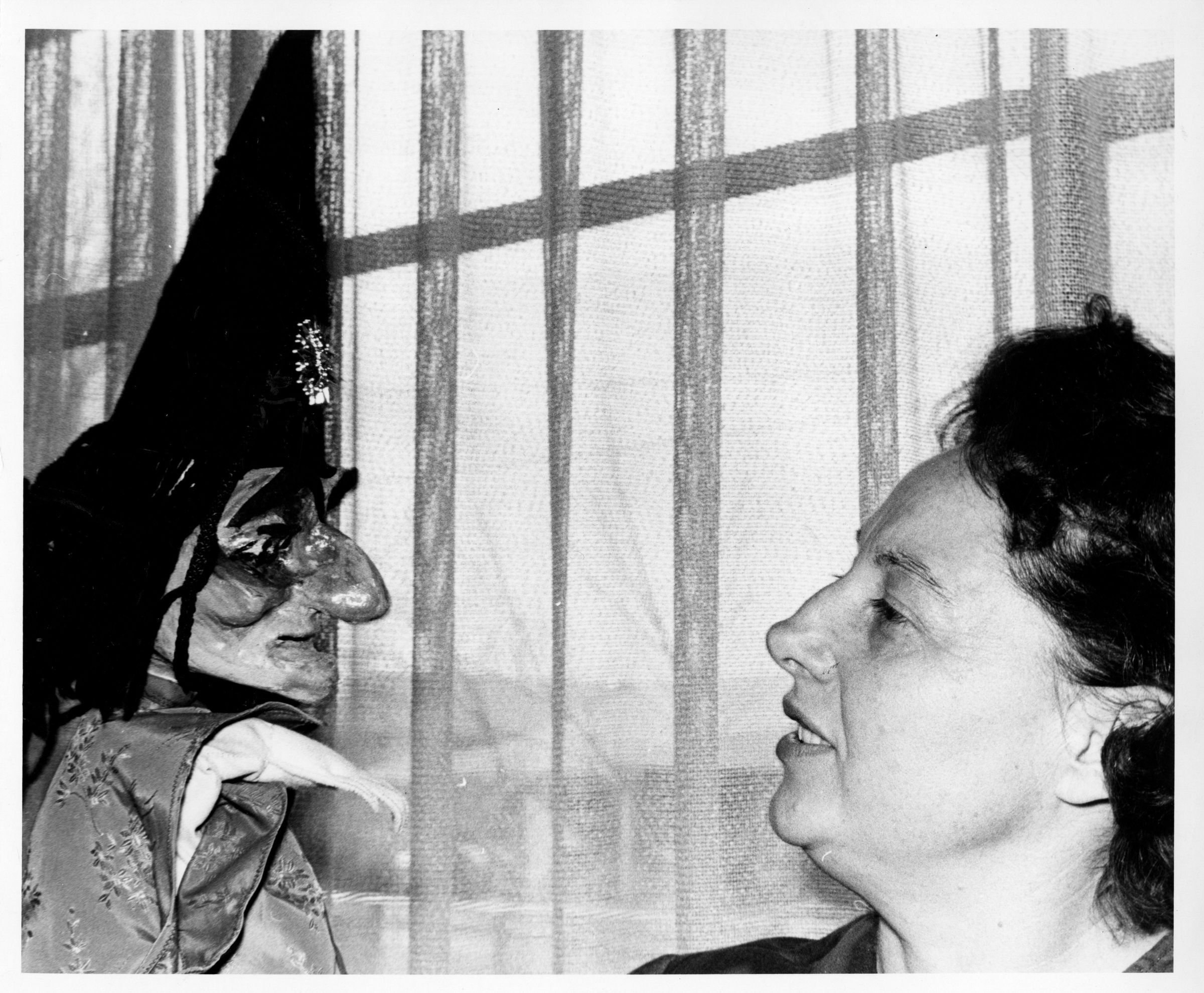 Black and white photo with Mrs. Charles DeVore staring at puppet in a witch's outfit