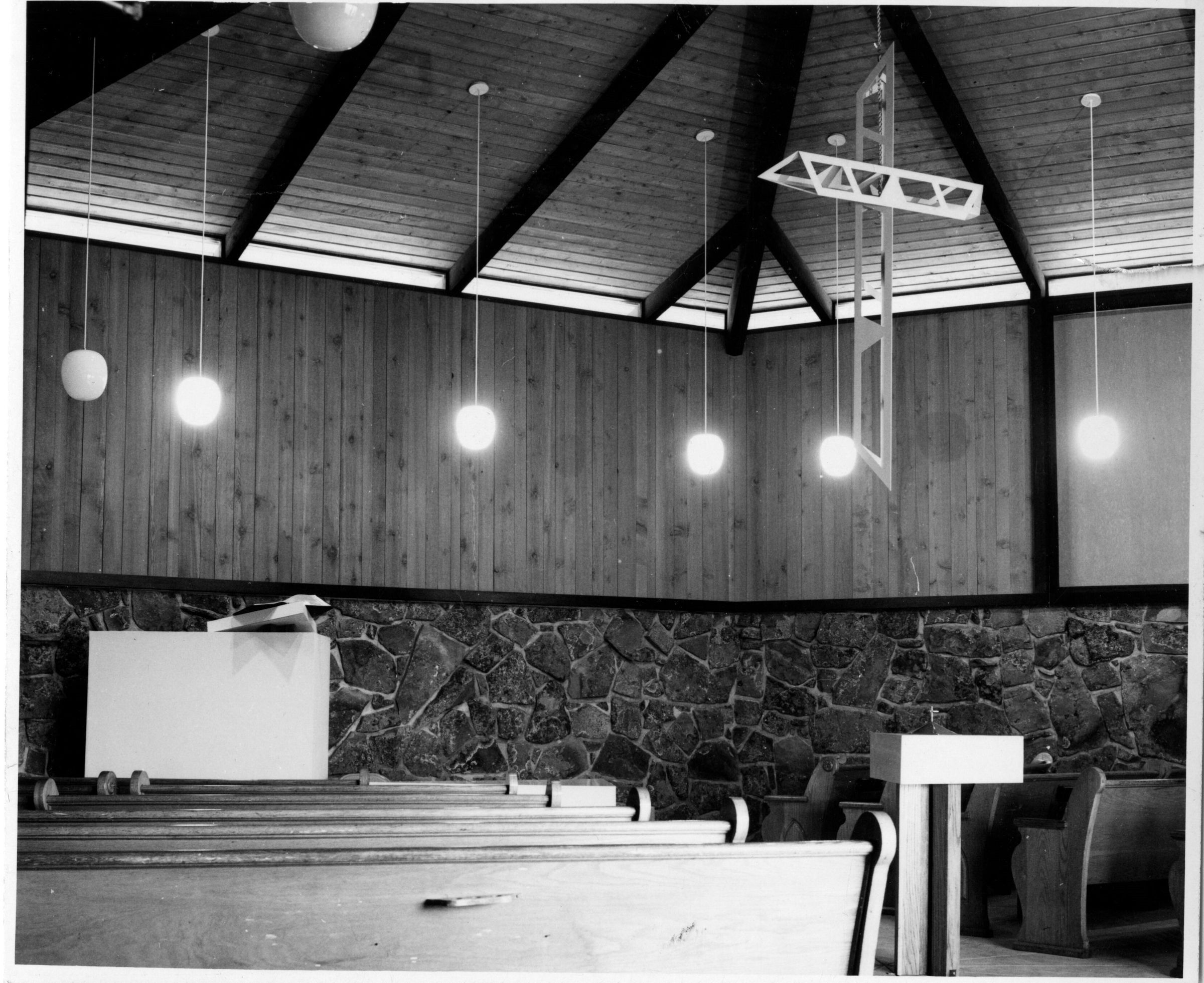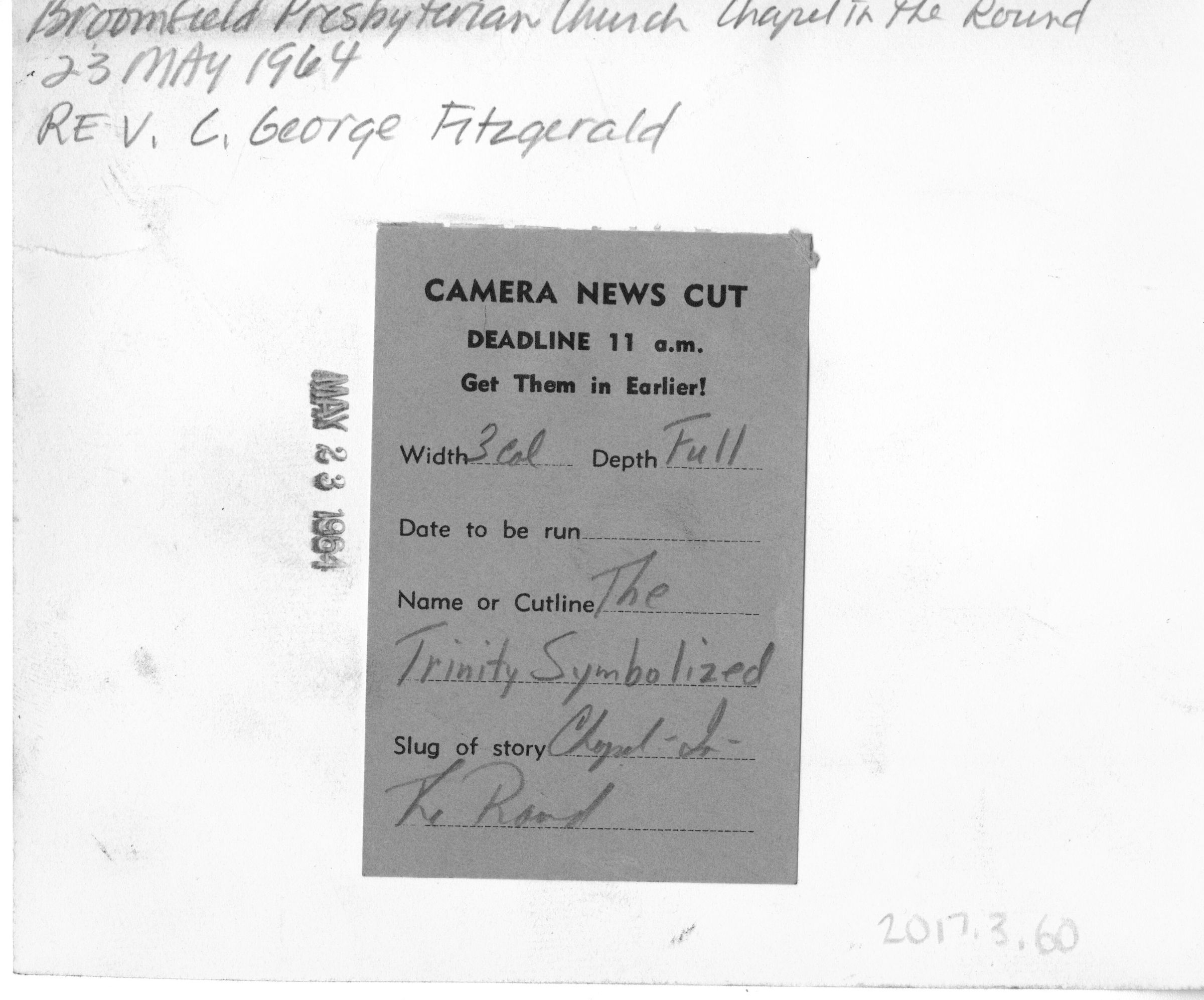 Black and white photo of the Broomfield Presbyterian Church Chapel in the Round. Rev. C. George Fitzgerald. Note on back, Camera News Cut, The Trinity Symbolized Interior shot of church pews, podium, hanging crucifix from ceiling torn on right side
