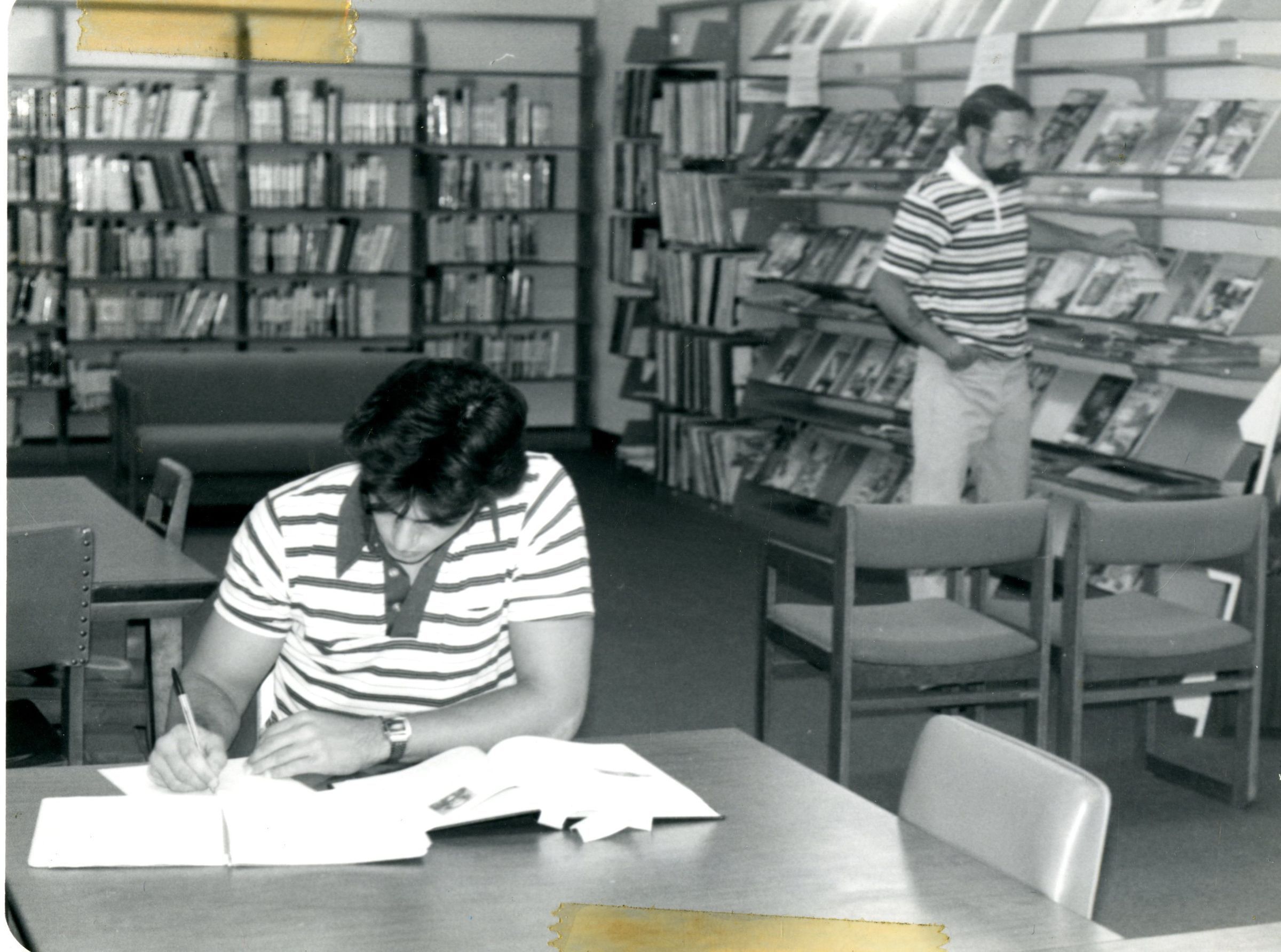 Interior photo of old Mamie Doud Eisenhower library at 12 Garden Center, Broomfield. Shows two men, one sitting at table writing, the other standing at a shelf of magazines. Black and white image.Collection