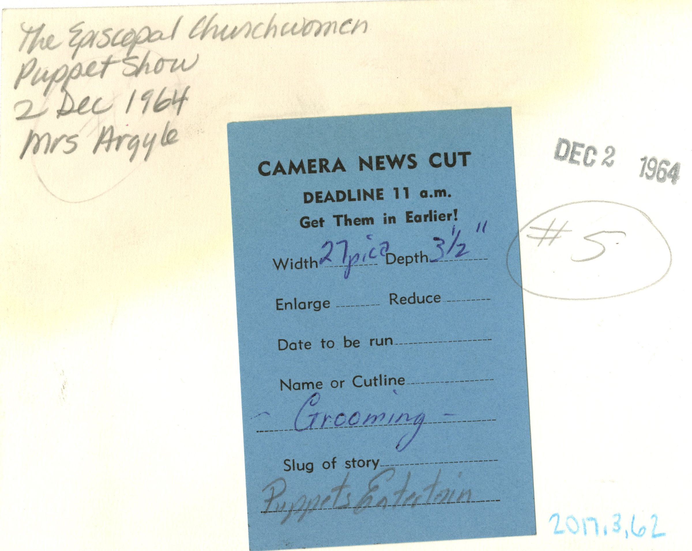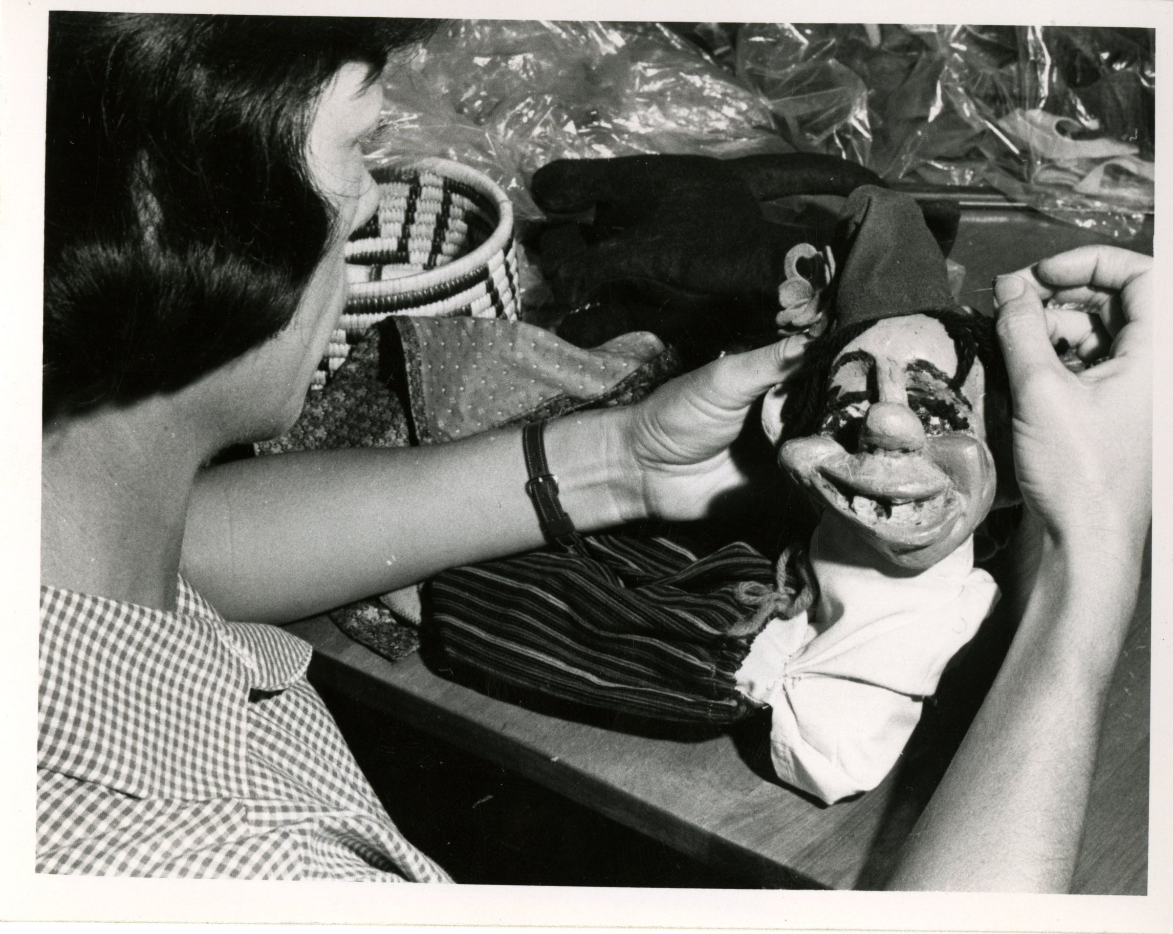 Mrs. Argyle preparing a puppet for a puppet show at the Episcopal Church on December 2, 1964.