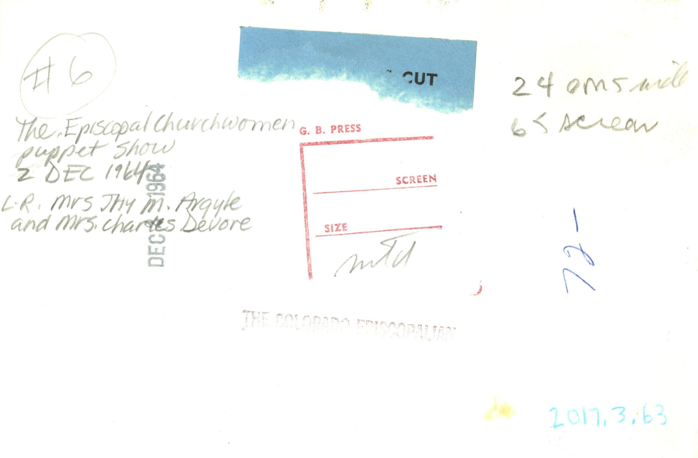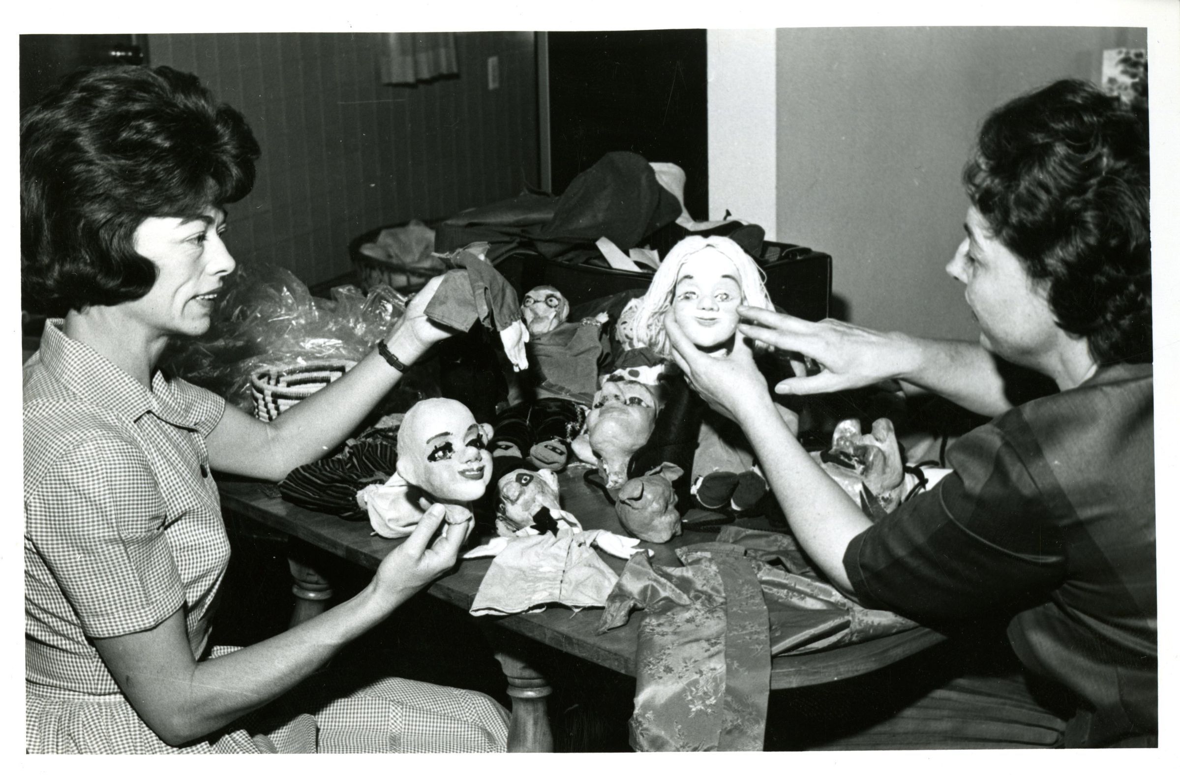 Mrs. Jay M. Argyle and Mrs. Charles Devore with puppets for a puppet show at the Episcopal Church on December 2, 1964.