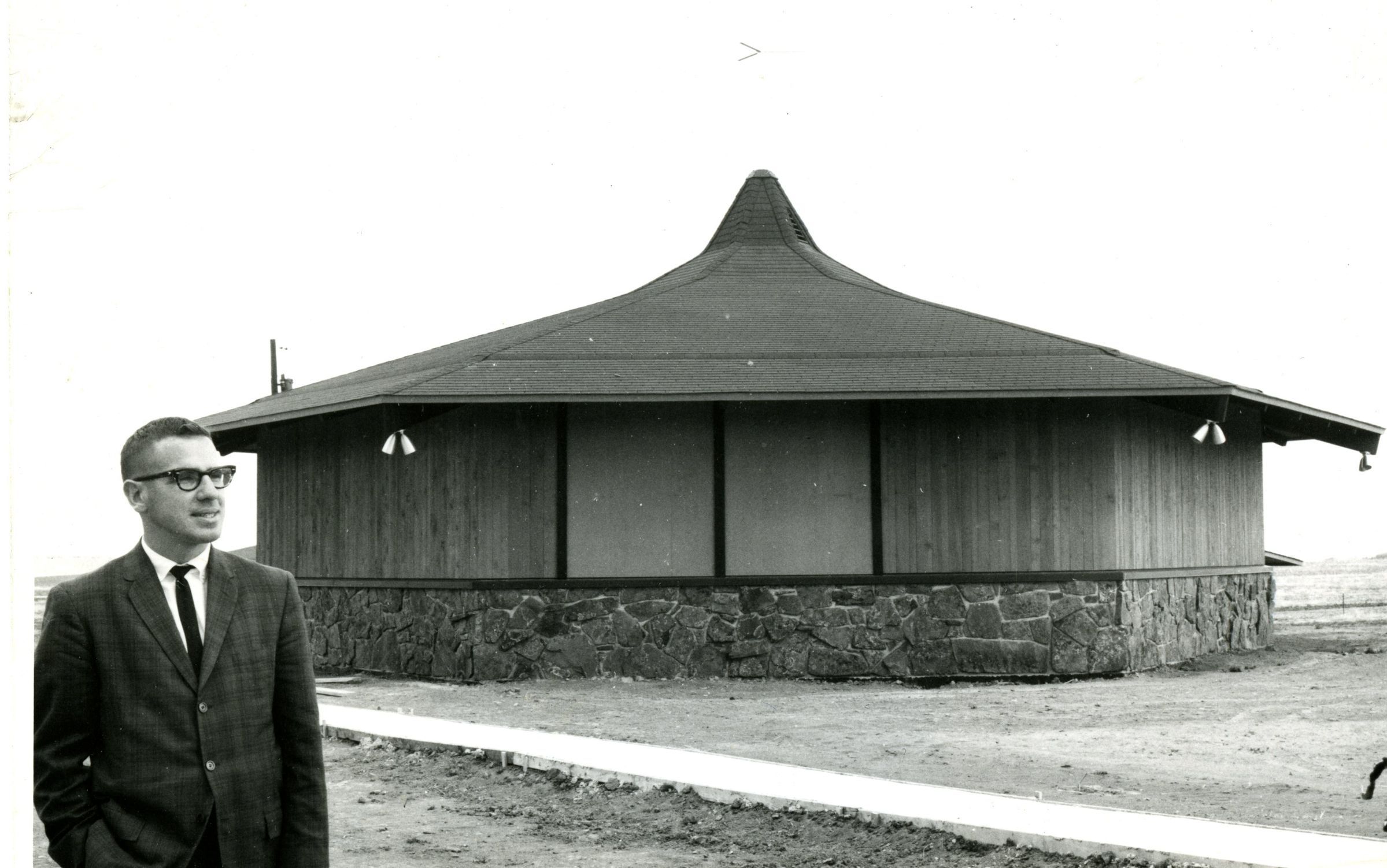 A man standing in front of the Broomfield Presbyterian Church - Chapel in The Round - on May 25, 1964.