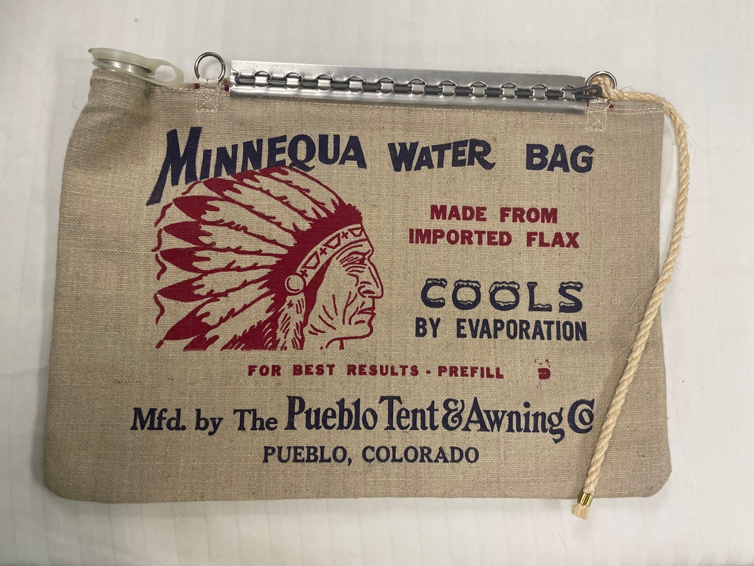 This a Minneque Water Bag. The outside is lined with canvas fabric with a side profile view of an Indian printed on the left side in red ink under the title. Next to it says "Made from Imported Flax", "Cools by Evaporation", For Best Results Prefill" "Mfd. by The Pueblo Tent & Awning Co Pueblo, Colorado. These are in red and blue ink alternating. On the back it says "Broomfield Days" with mountains behind it and "Sept 17.18.19 Broomfield Colo." under it. It appears to be never used or wasn't used often. on the top has a tiny circular opening and lid. There's a metal component going across with2 circular loops on each side, on loop has a piece of rope tied around. This a Broomfield Day merchandise or souvenir.Collection