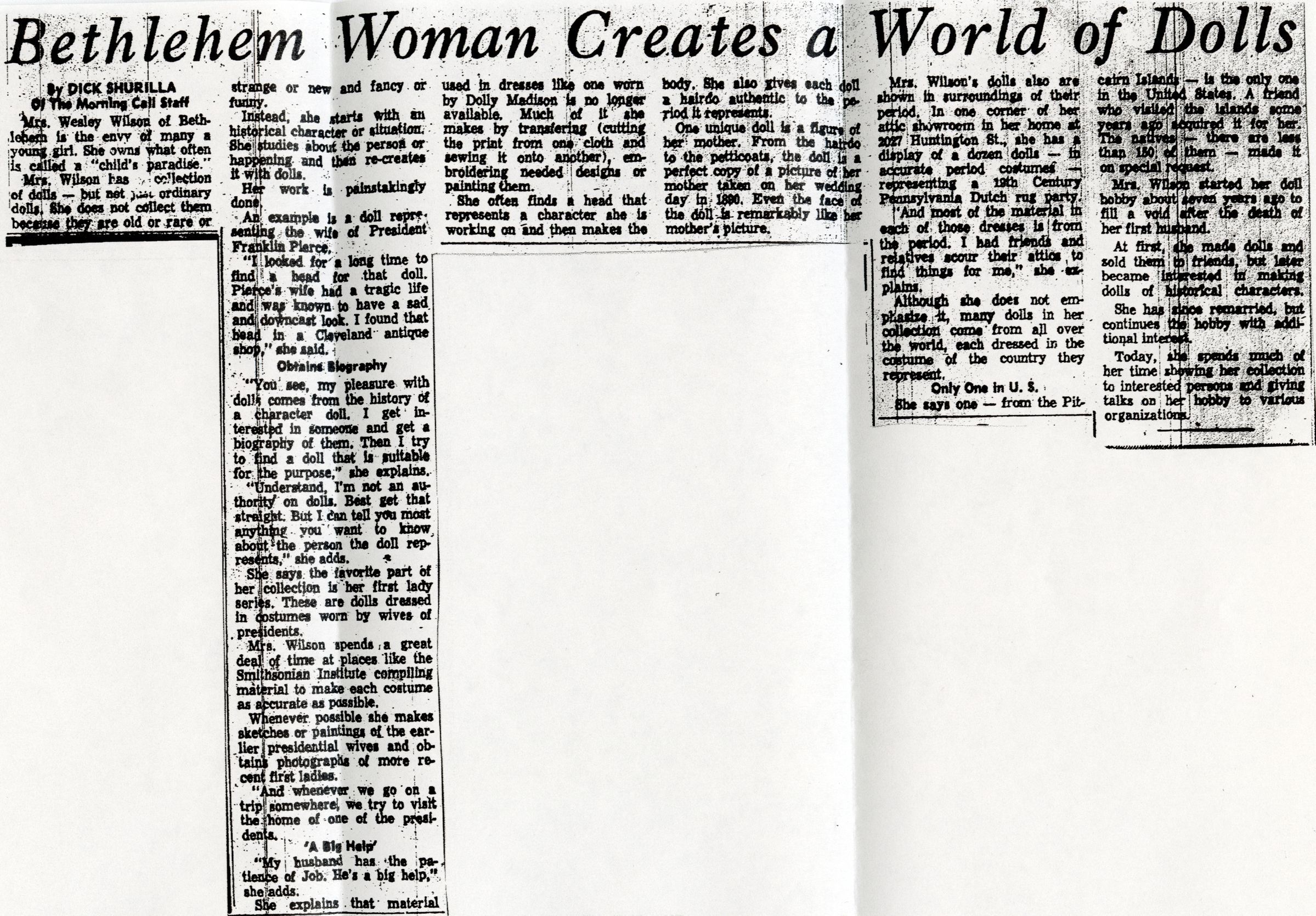 The first article, titled "Bethlehem Woman Creates a World of Dolls," was written by Dick Shurilla for The Morning Call. This article details the work of Mrs. Wesley Wilson, a resident of Bethlehem, Pennsylvania, who creates dolls based on historical figures. She painstakingly crafted each doll based on research she conducted about the person she is representing. Wilson even matches the hairdo and outfits of the dolls to the correct country and time period that they lived in. She stated that her hobby began seven years prior after her first husband's death and has continued since.