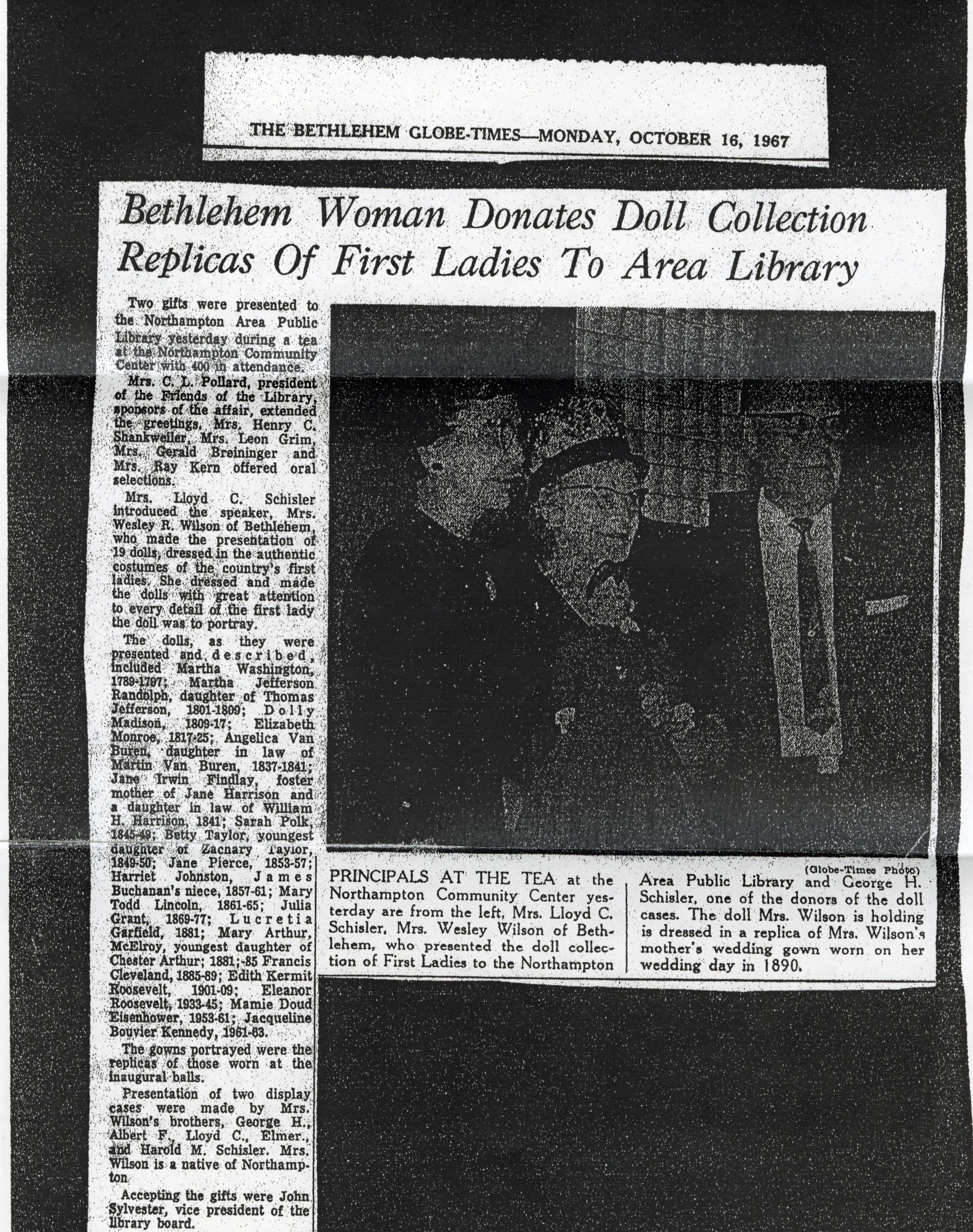 The second article, titled "Bethlehem Woman Donates Doll Collection Replicas Of First Ladies to Area Library," was published by The Bethlehem Globe-Times on Monday, October 16, 1967. This article outlines Wilson's donation of her collection of historical First Lady dolls to the Northampton Area Public Library in Pennsylvania. In addition to the her collection, Wilson's brothers presented the donated display cases that these 19 dolls were to be stored in. There is a black-and-white photo along with the article that features Wilson flanked by her sister-in-law and one of her brothers. She is shown holding a doll replica of her mother in the picture.Collection