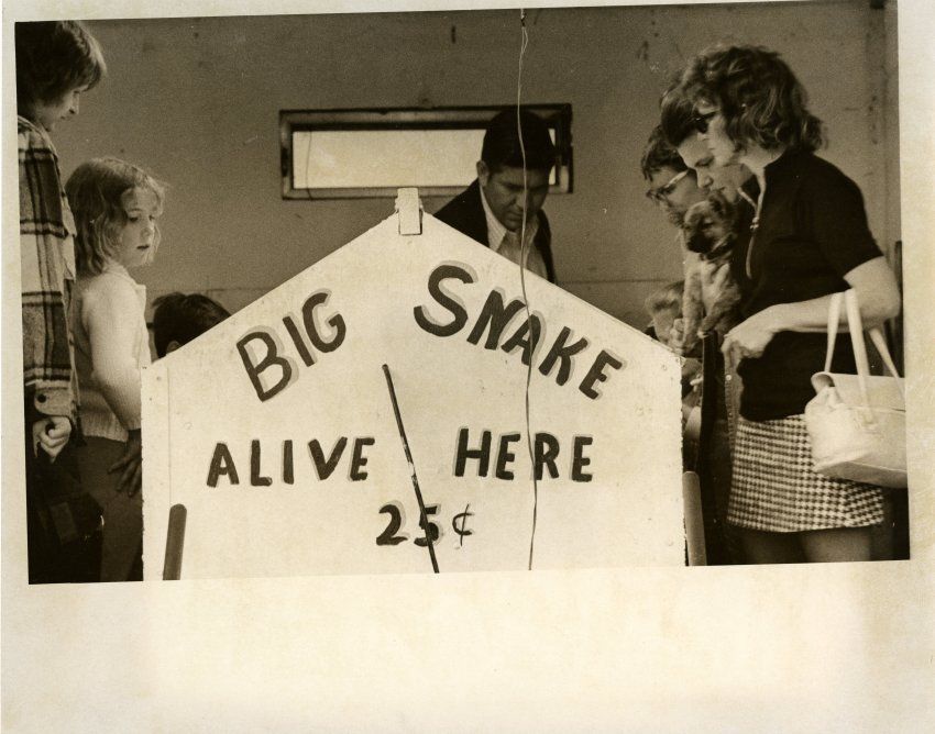 People looking into box labeled, Big Snake Alive Here 25 cents