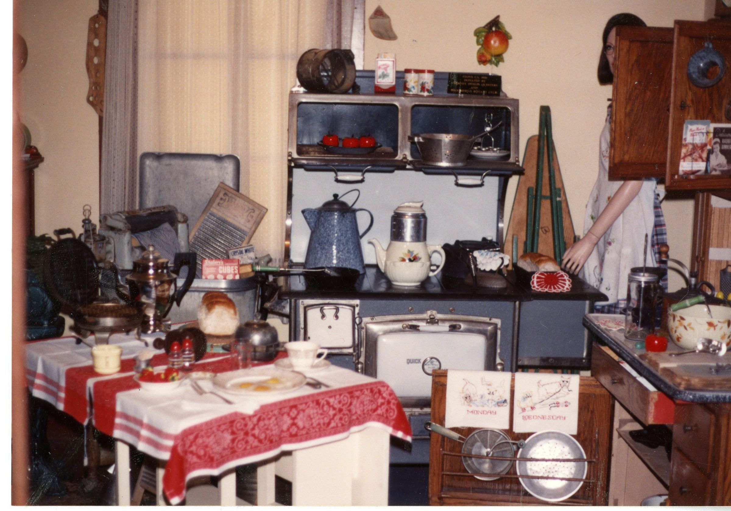 Color photograph showing a kitchen. The left side has a table with one place setting. The right side of the image has cabinets. Against the far wall is a window and an old stove. There is a person partially hidden by the cabinets.