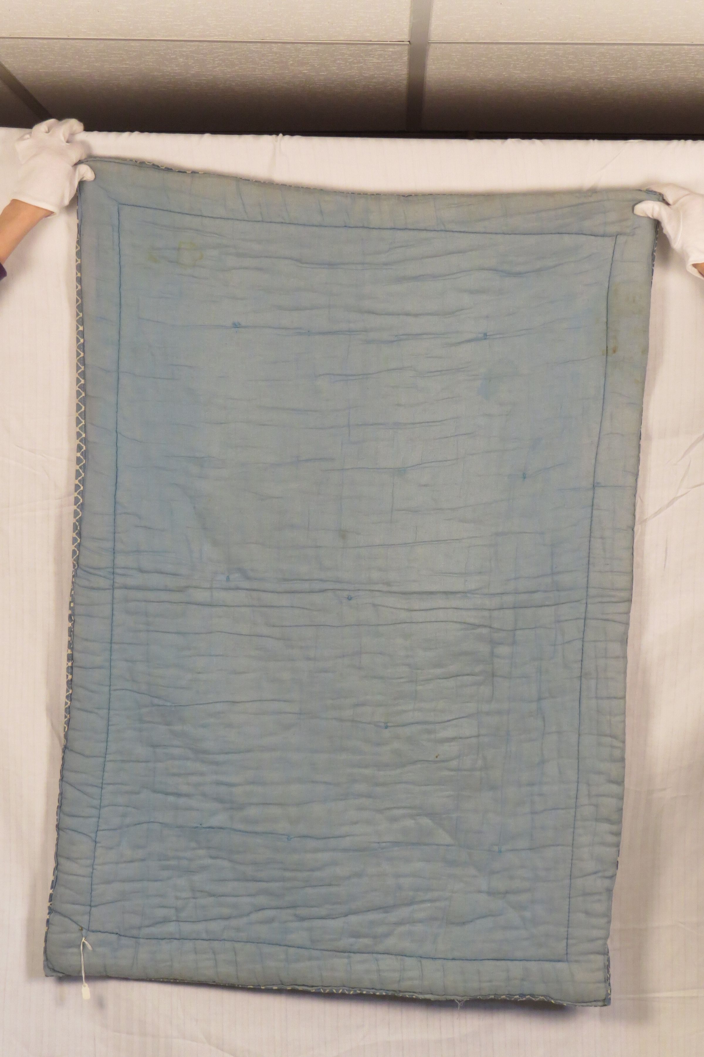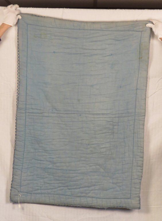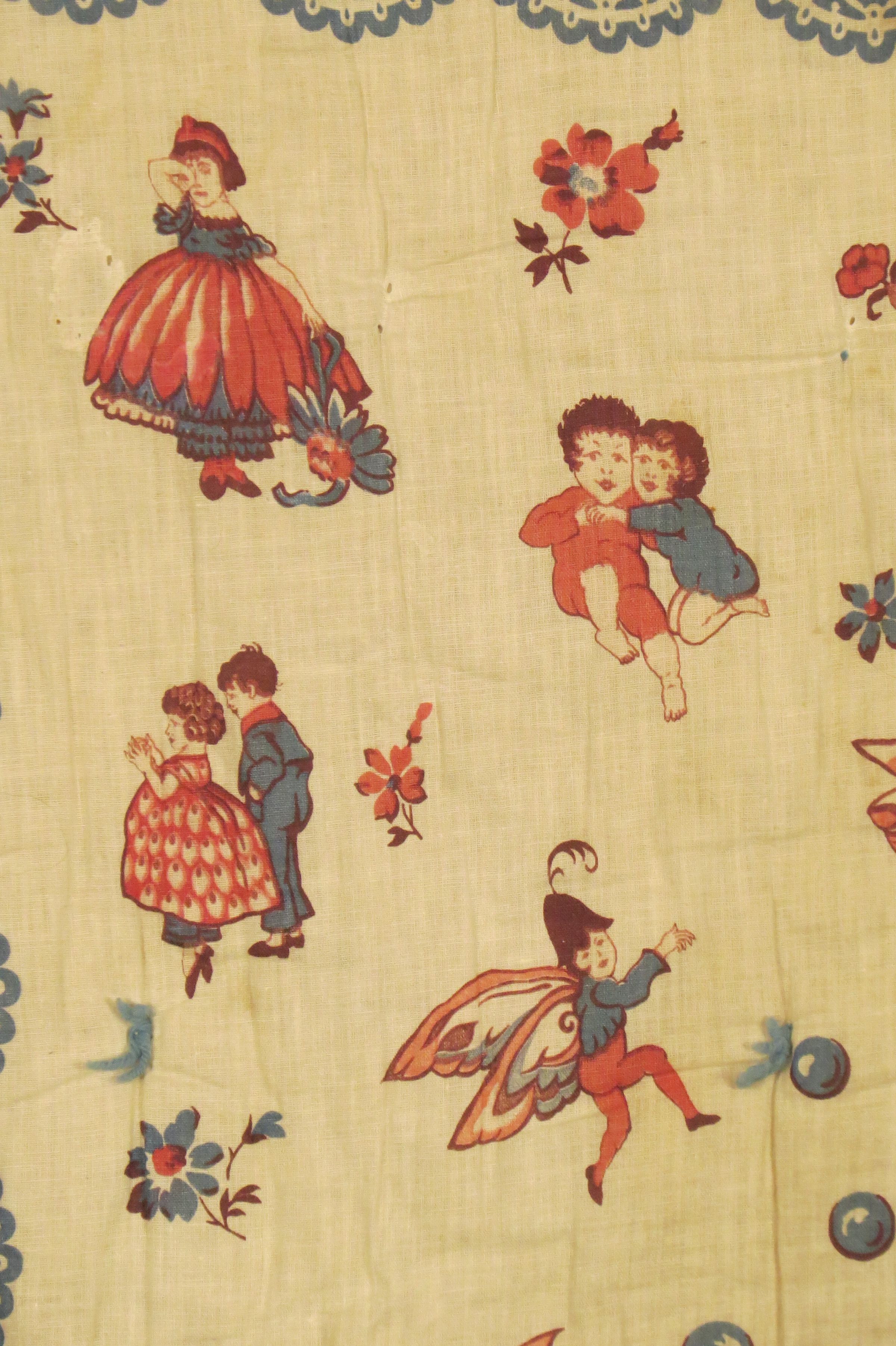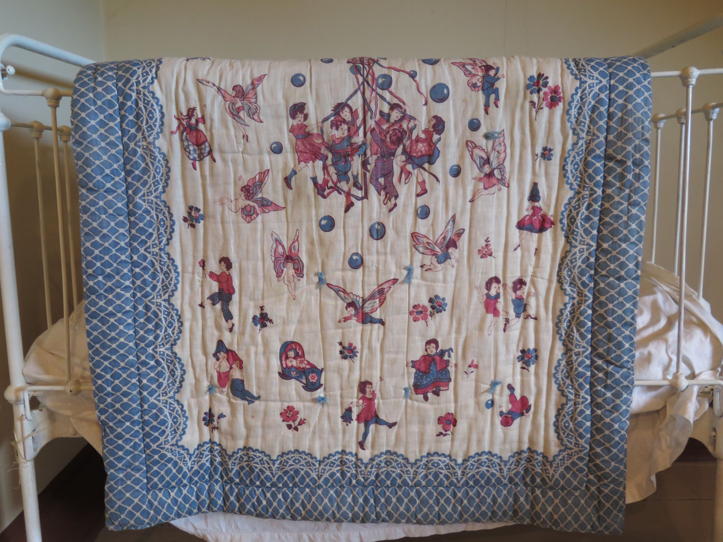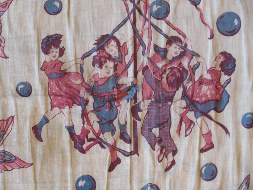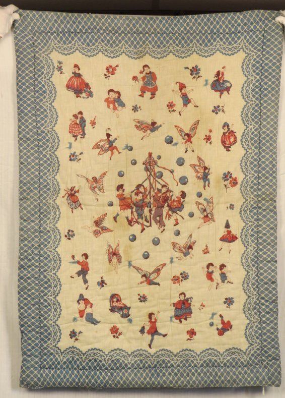 Pre-printed whole cloth 30" (w) x 45" (l) crib quilt. The printed fabric is the exact dimensions of finished crib/baby quilt. Image is of a May Day celebration with children dancing around a May Pole. One machine quilted stitch around outside and hand-tied wool yarn through middle.