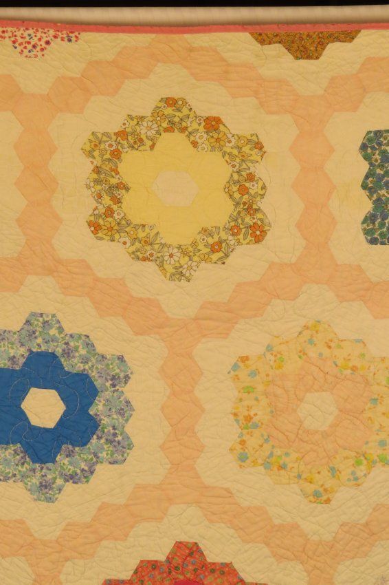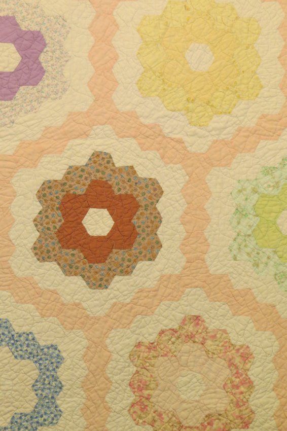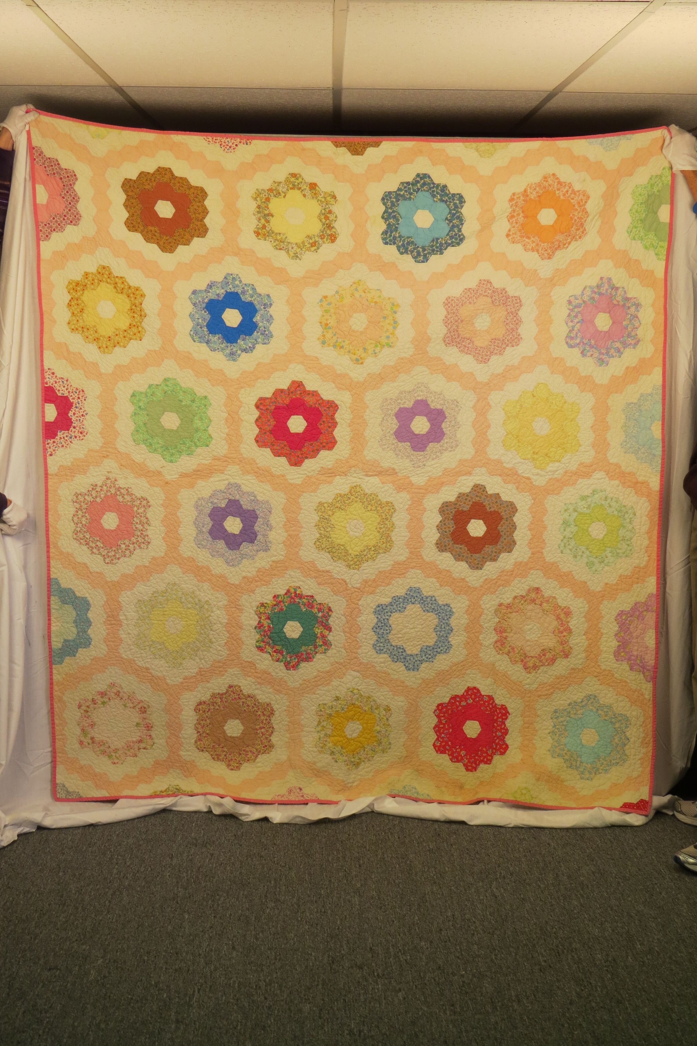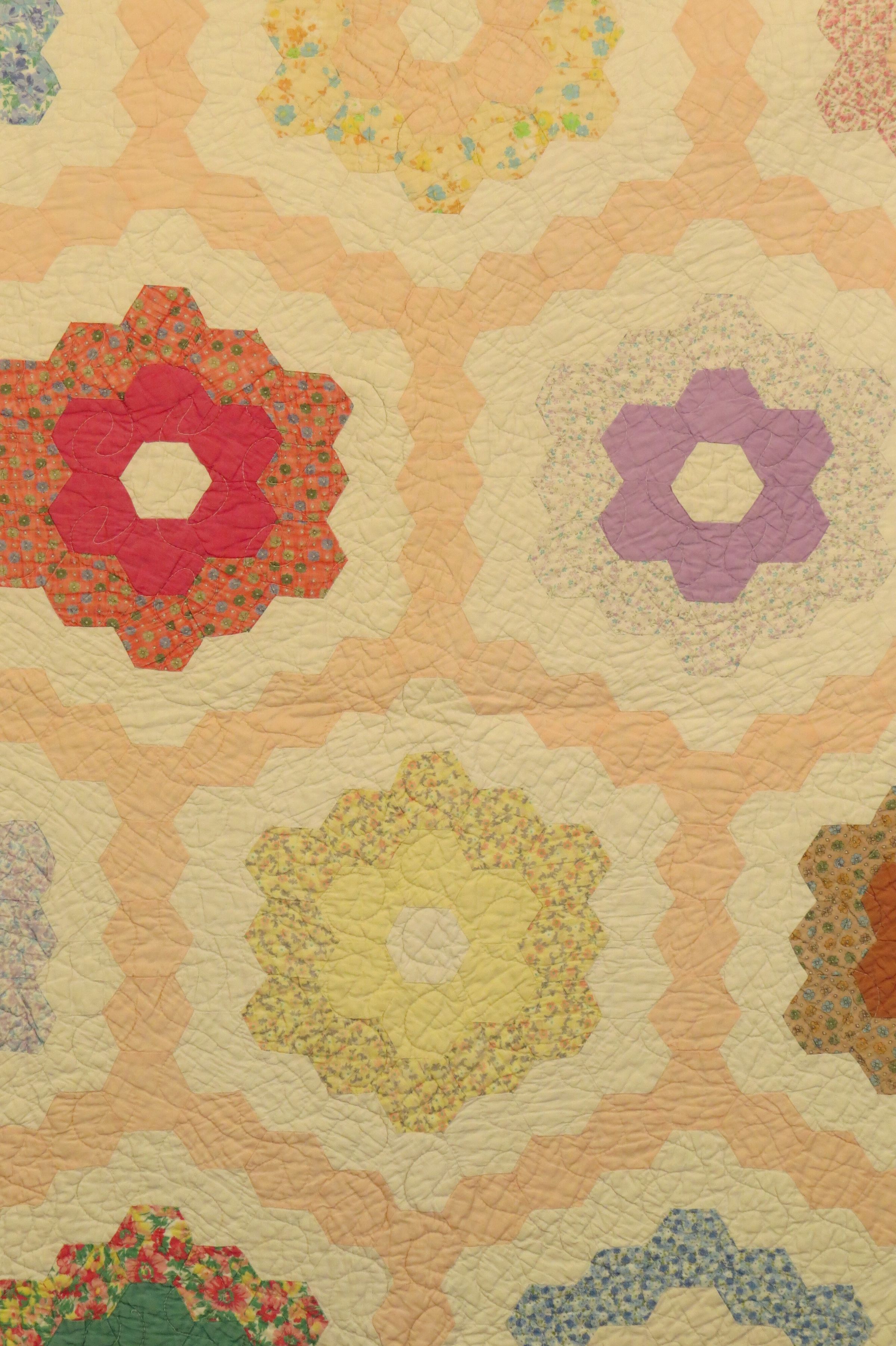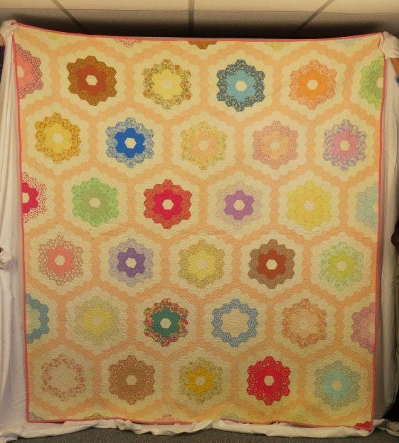 Grandmother's Flower Garden. Pastel calico hexigons. Hand pieced. Machine Quilted. Pink straight binding. The quilt measures 79" (h) x 73" (w).