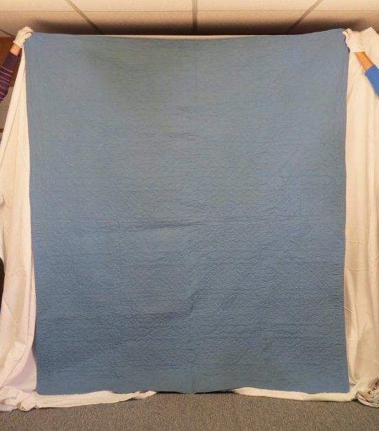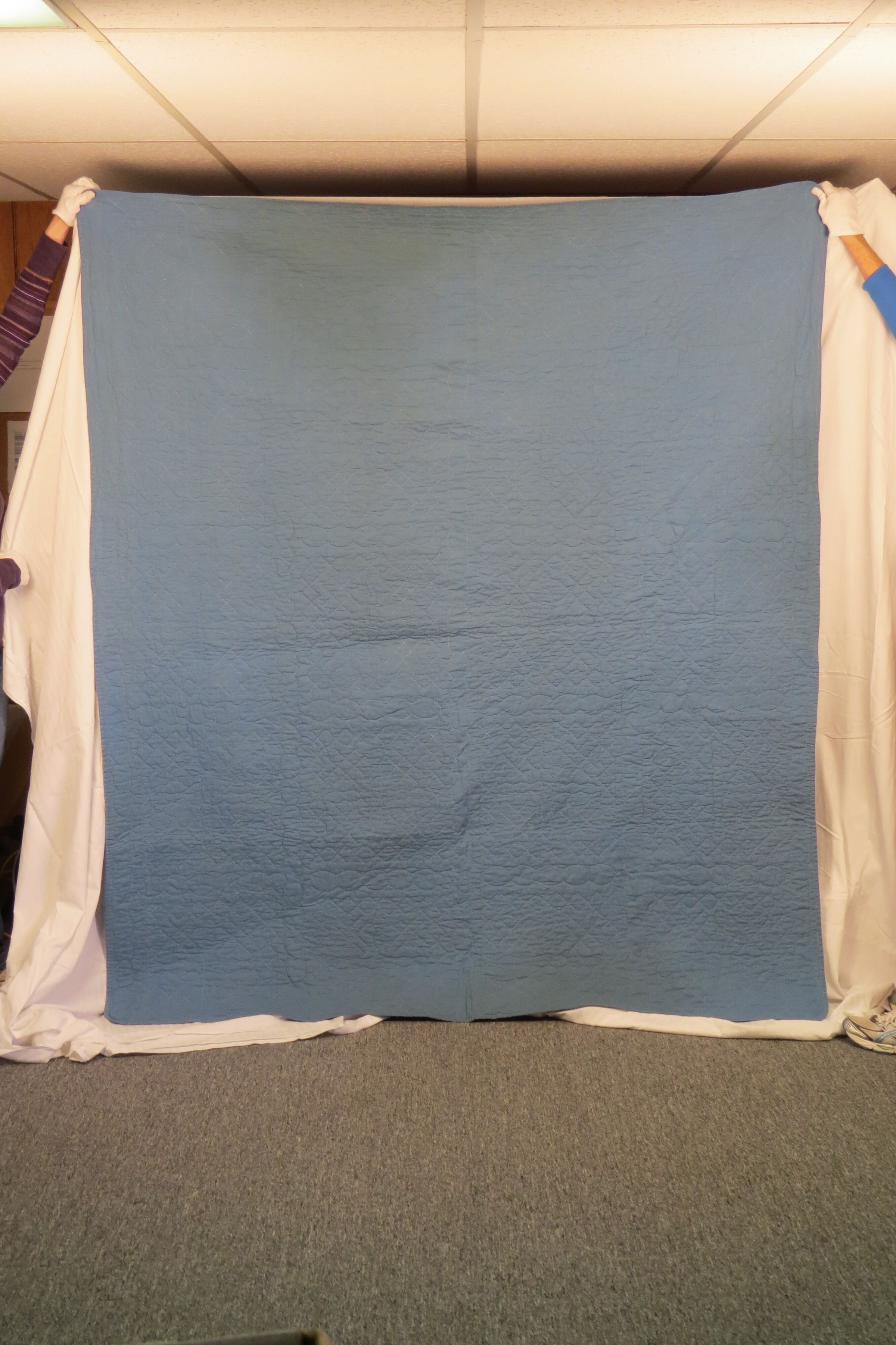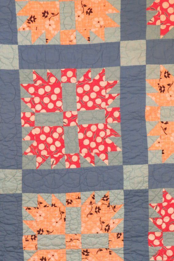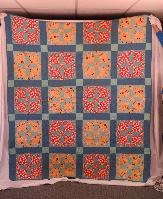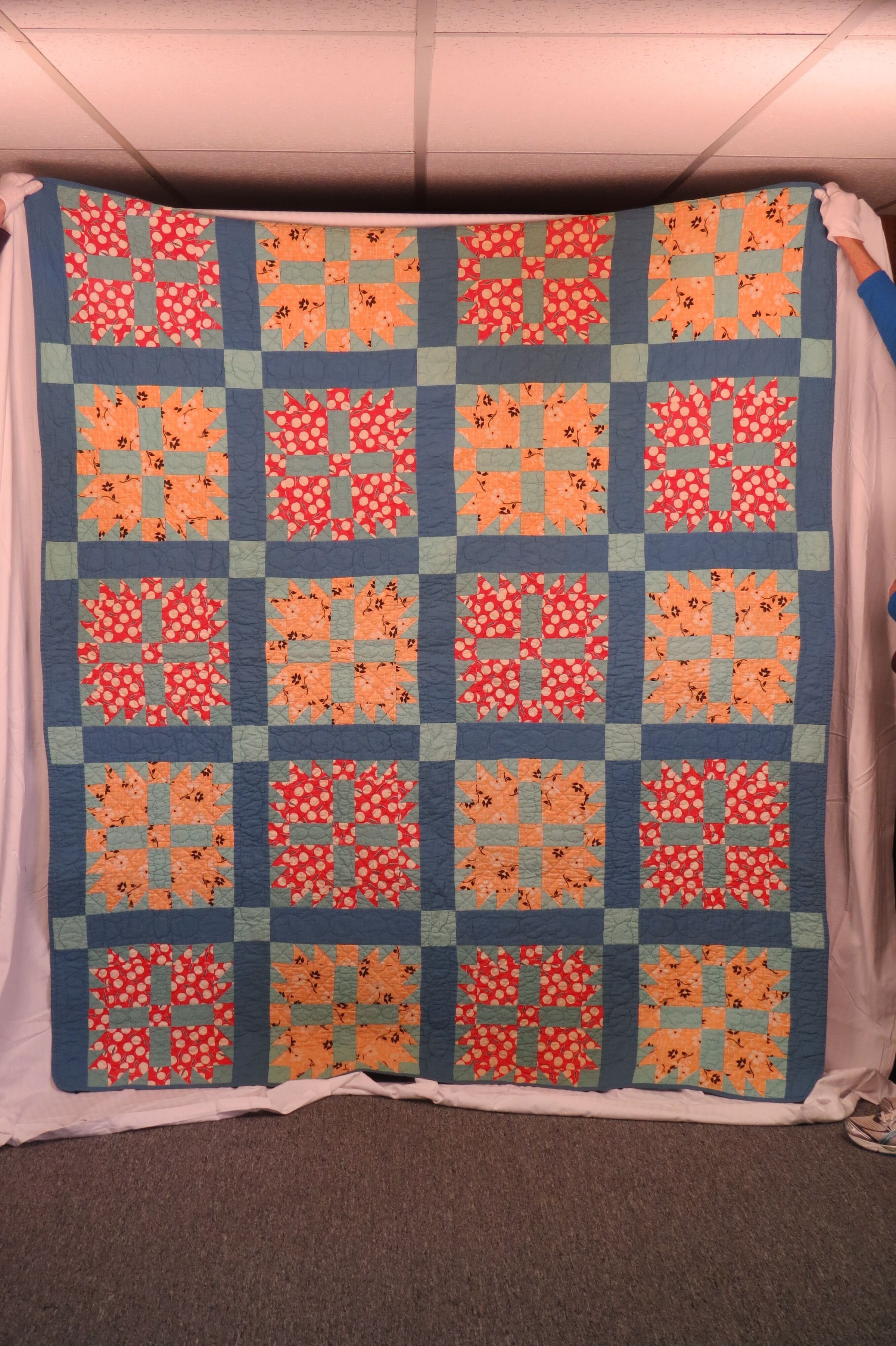This is an 8-point star variation quilt with blocks surround by blue sashing. The calicos used in the blocks are blue, turquoise, orange and red. Hand pieced, hand quilted. Hand sewn straight binding. The quilt measures 70.5" (w) x 80.5" (l).Collection
