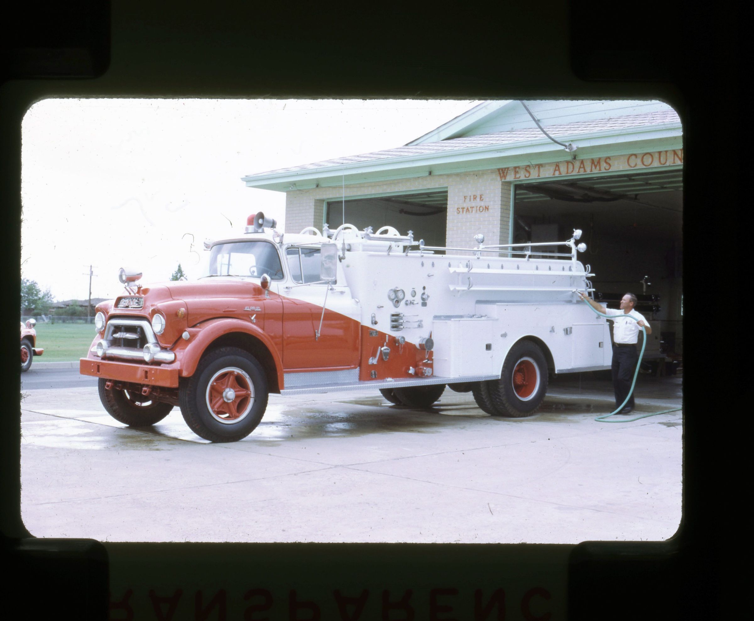 A color transparency depicting a white-and-red fire truck parked outside of WACFPD Station 2, located at Midway & Laurel in Broomfield, CO. The truck in the image is a 1958 GMC 550 American, equipped with a 500 gallon water tank and 750gpm pump. Beside the truck is a man cleaning it with a water hose.