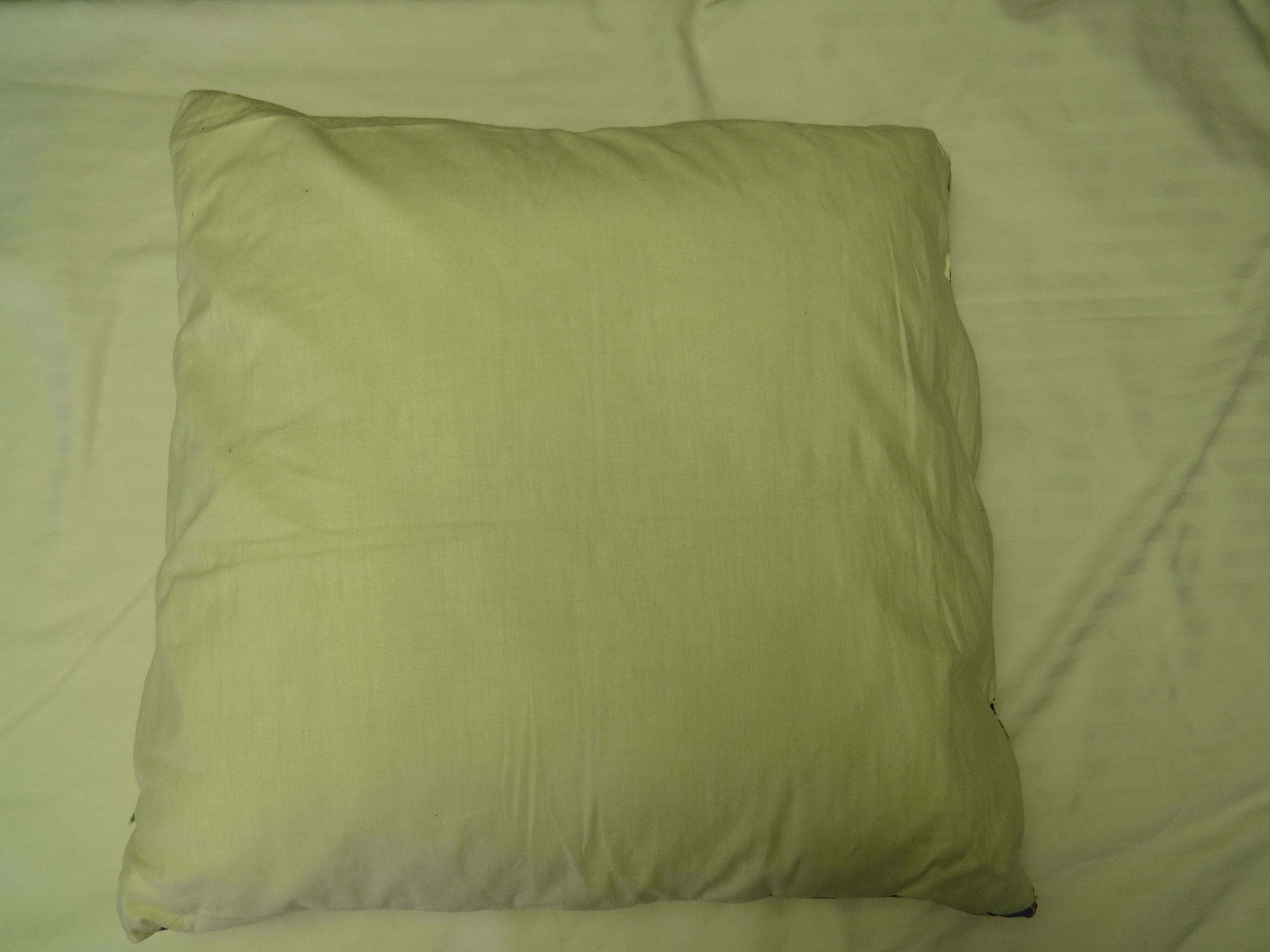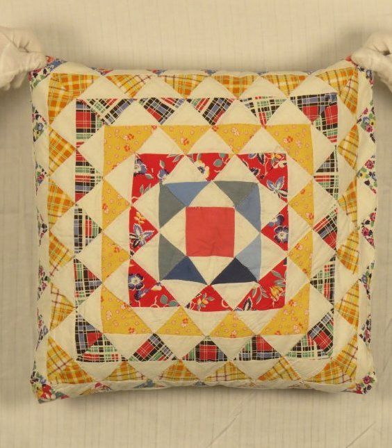 This is a pillow with a flying geese quilt pattern. The pillow is white with blue and peach solids, yellow stripes and plaids, blue/red floral, purple/blue green floral, blue/red/green plaid. The pillow has a white backing. The pillow measures 17" (h) x 17" (w) x 3" (d).Collection