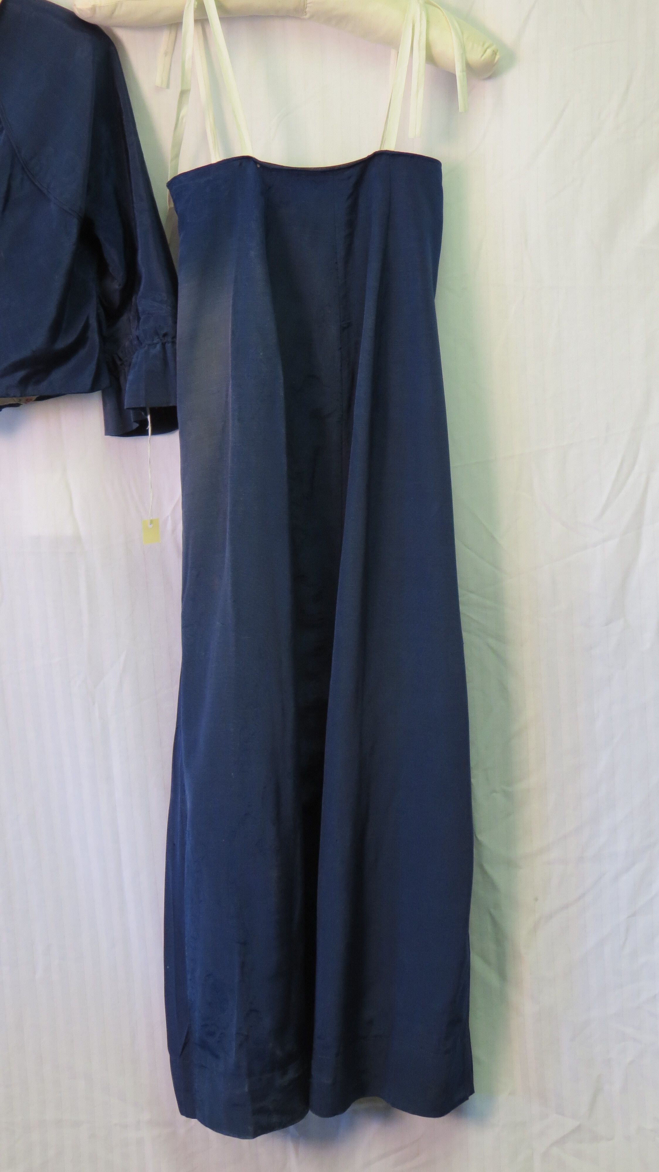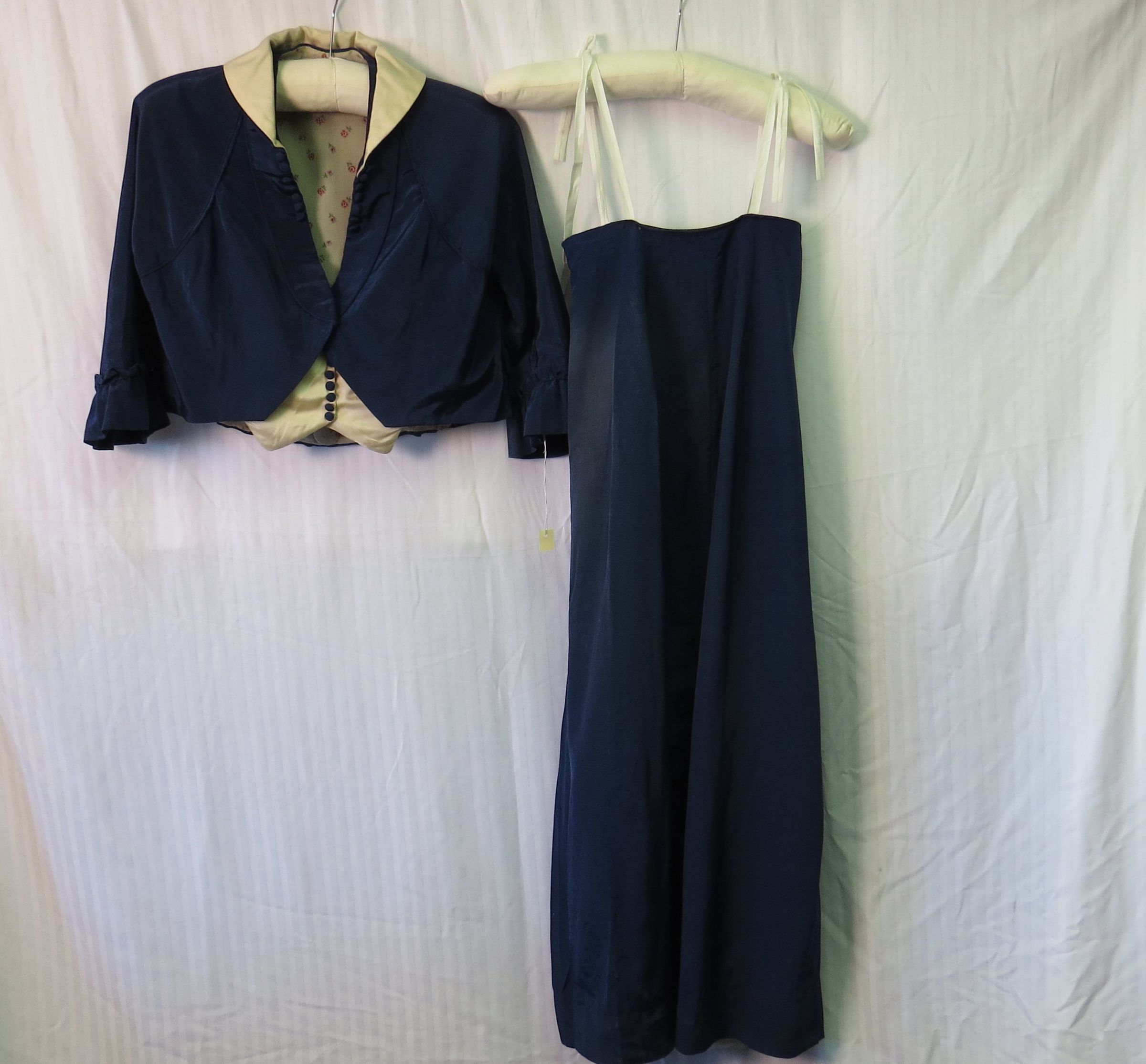 This wedding ensemble consists of two pieces, a jacket (a) and a skirt (b). They are navy blue moire silk.