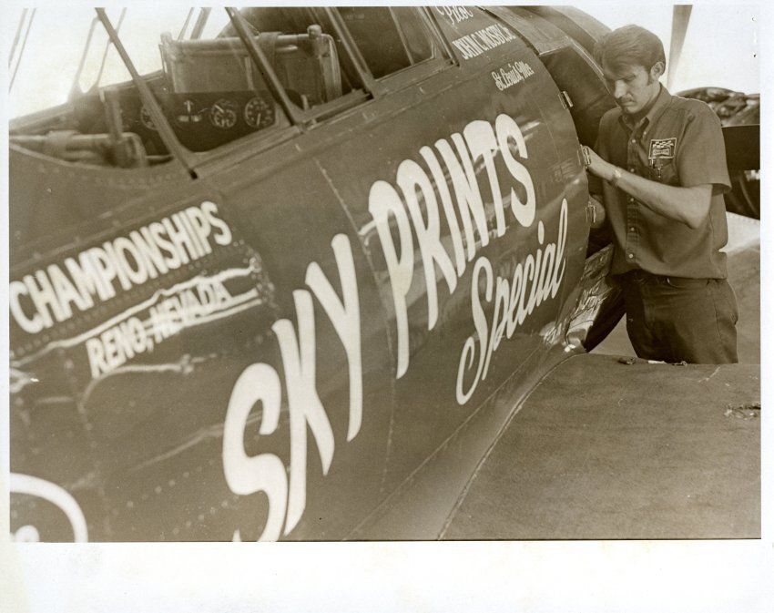 Close up of plane with man working. On the side of plane: "Sky Prints Special"; "Championships, Reno Nevada" and "Pilot, John C. Mosby Jr., St. Louis, MO"Collection
