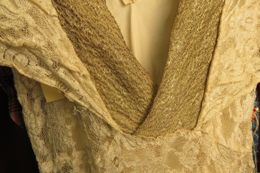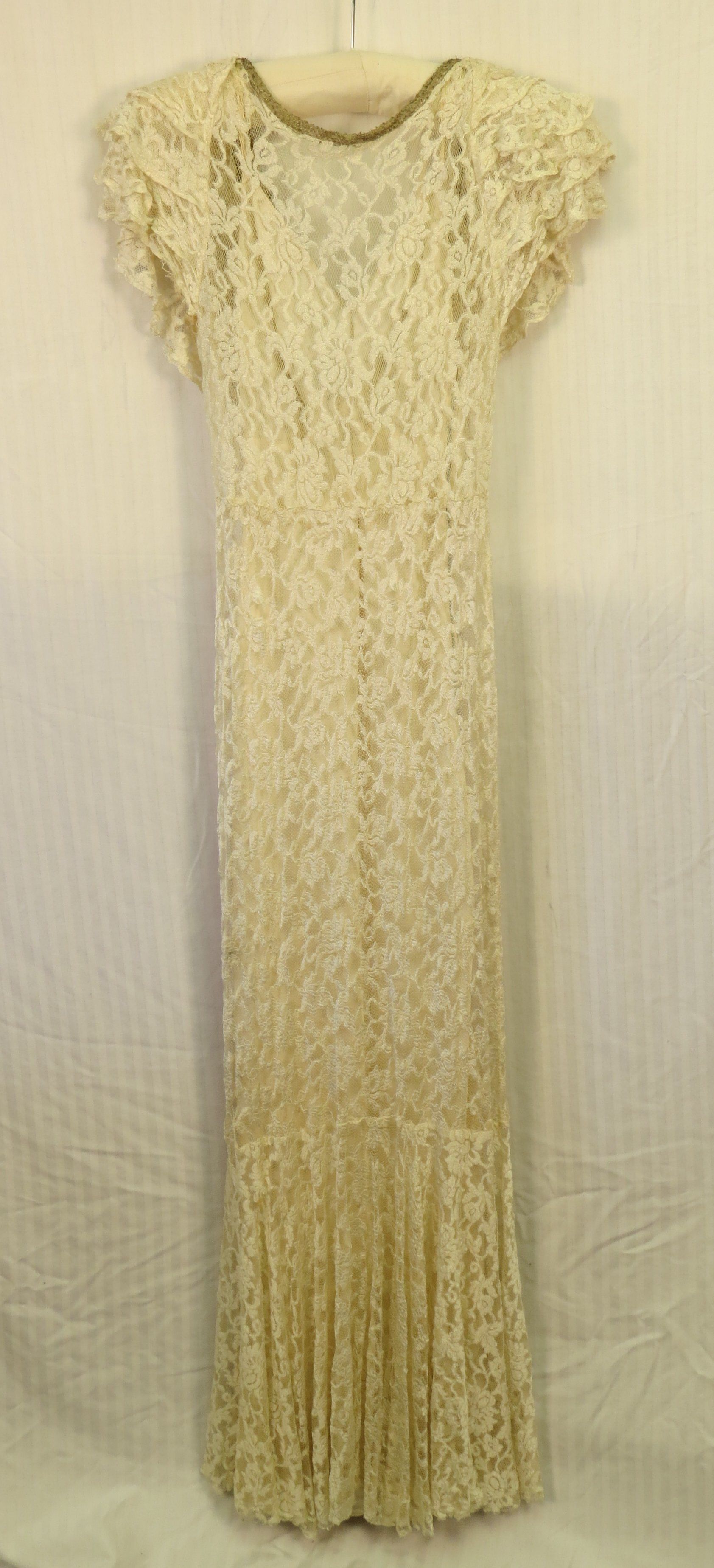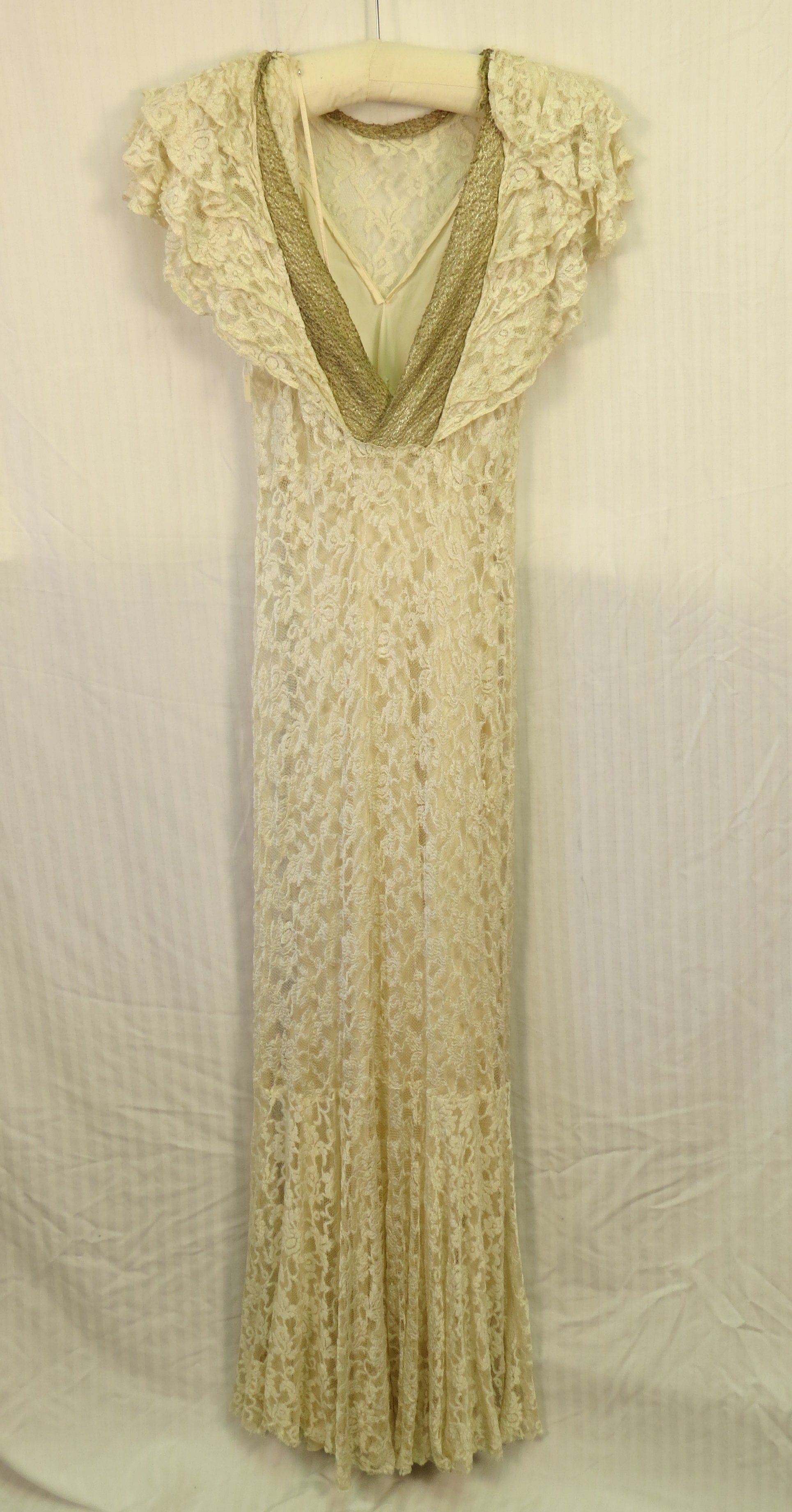 a.) Ivory Lace columnar full-length dress, Short cap sleeves made out of several tiers of ruffles. Embroidered silver fabric used as binding around the front of the neck and then widens into larger strips down back of dress. Back is cut low as was popular in the 1930s. Waistline at normal waist, skirt hugs the body to the calf where it then flares out with more width. The dress measures 18" (w) x 60" (l).