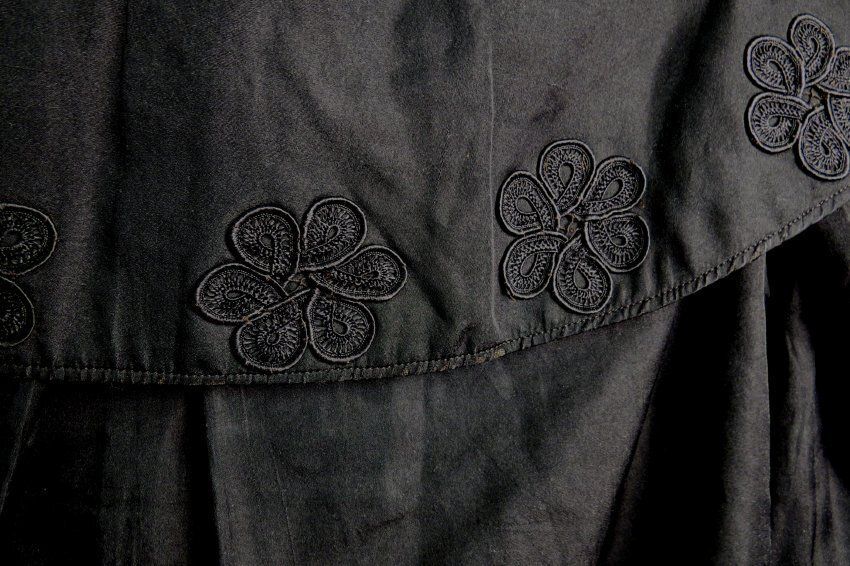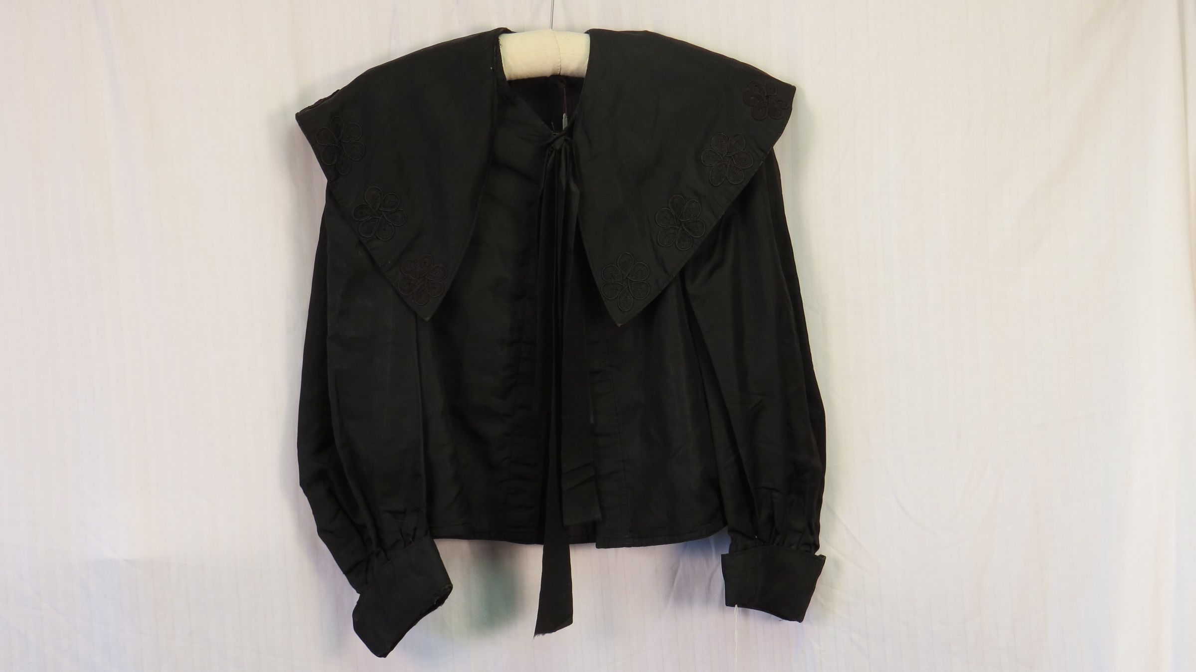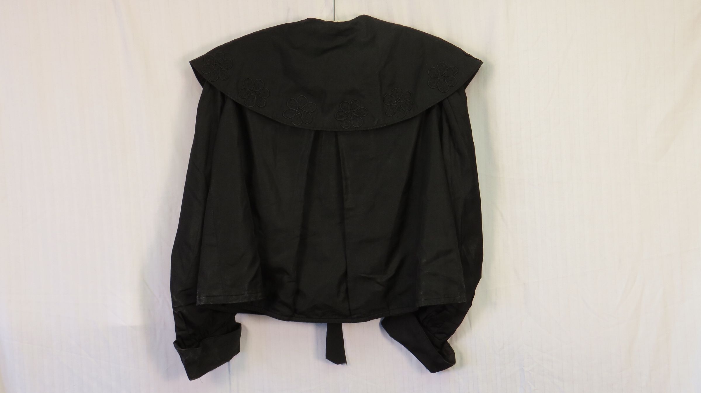 Black loose-fitting jacket. Large cape collar with applied black lace in the form of flowers or six connected loops. Black silk bow at neck. Sleeves are loose fitting and pleated into a frech cuff. Hooks and eyes close the jacket near the neck. Completed lined and has an attached cotton hanging loop (to be used for hanging on hooks). Jacket measures 22" (w) x 23" (l).