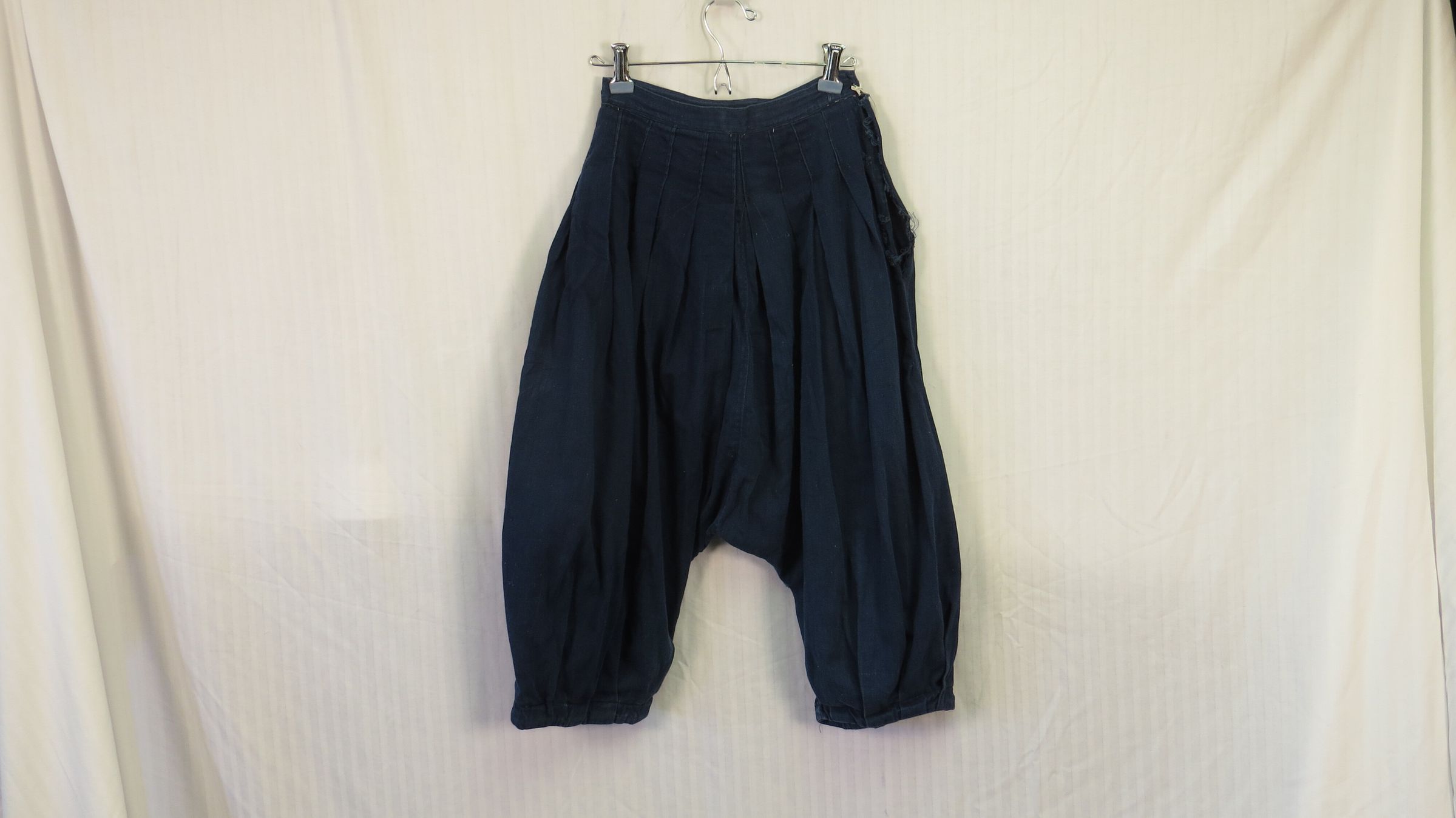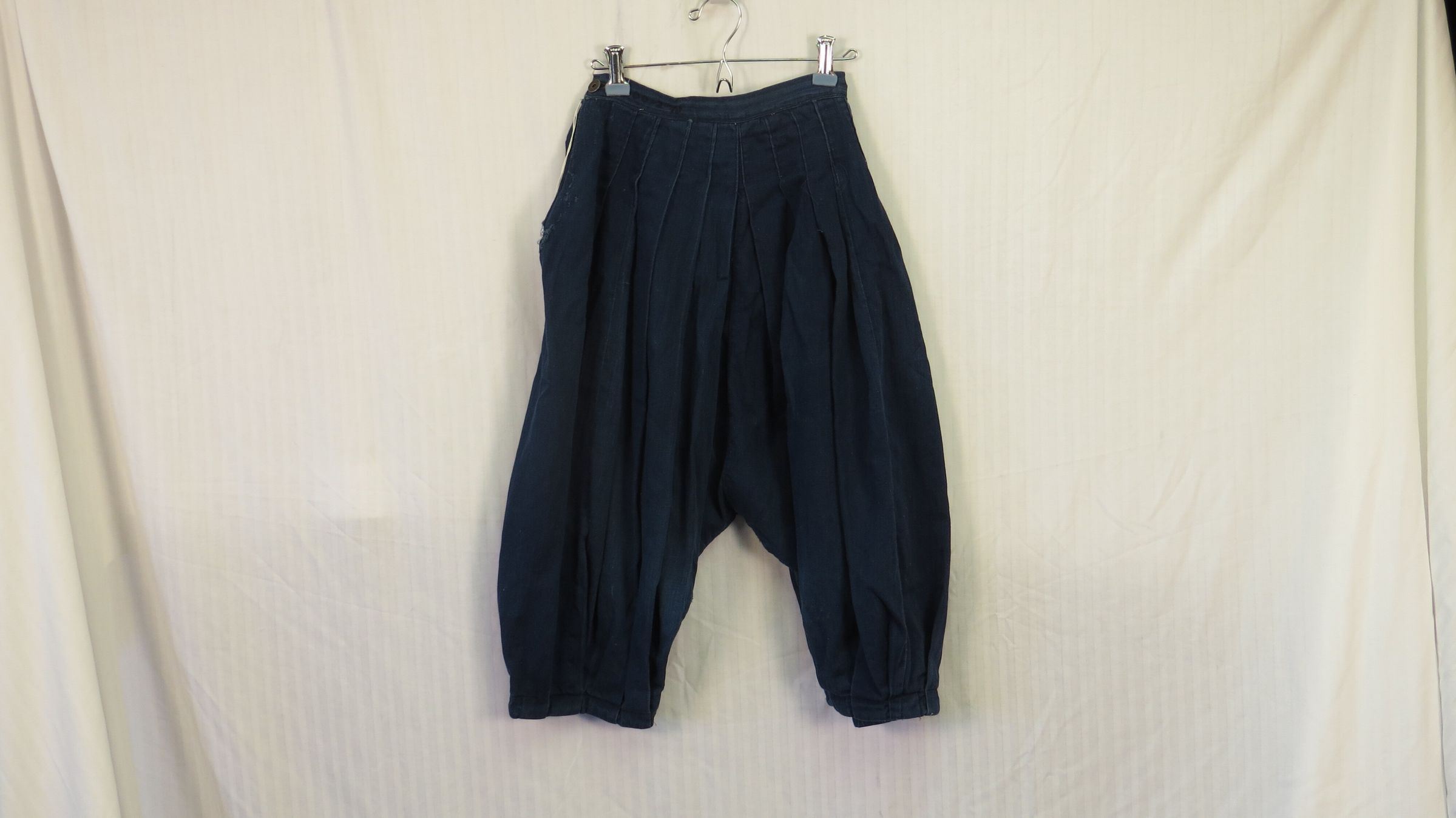 Navy blue twill bloomers. Fabric is almost a lightweight denim. Very voluminous bloomers with the fabric controlled by pleats at the waistband and below the knee. The pleats at the waist have been sewn day. A button closure on the side though there is an opening below that (has raveled). Number was written on the waistband with a marker of some sort. The bloomers measure 18" (w) x 30" (l).