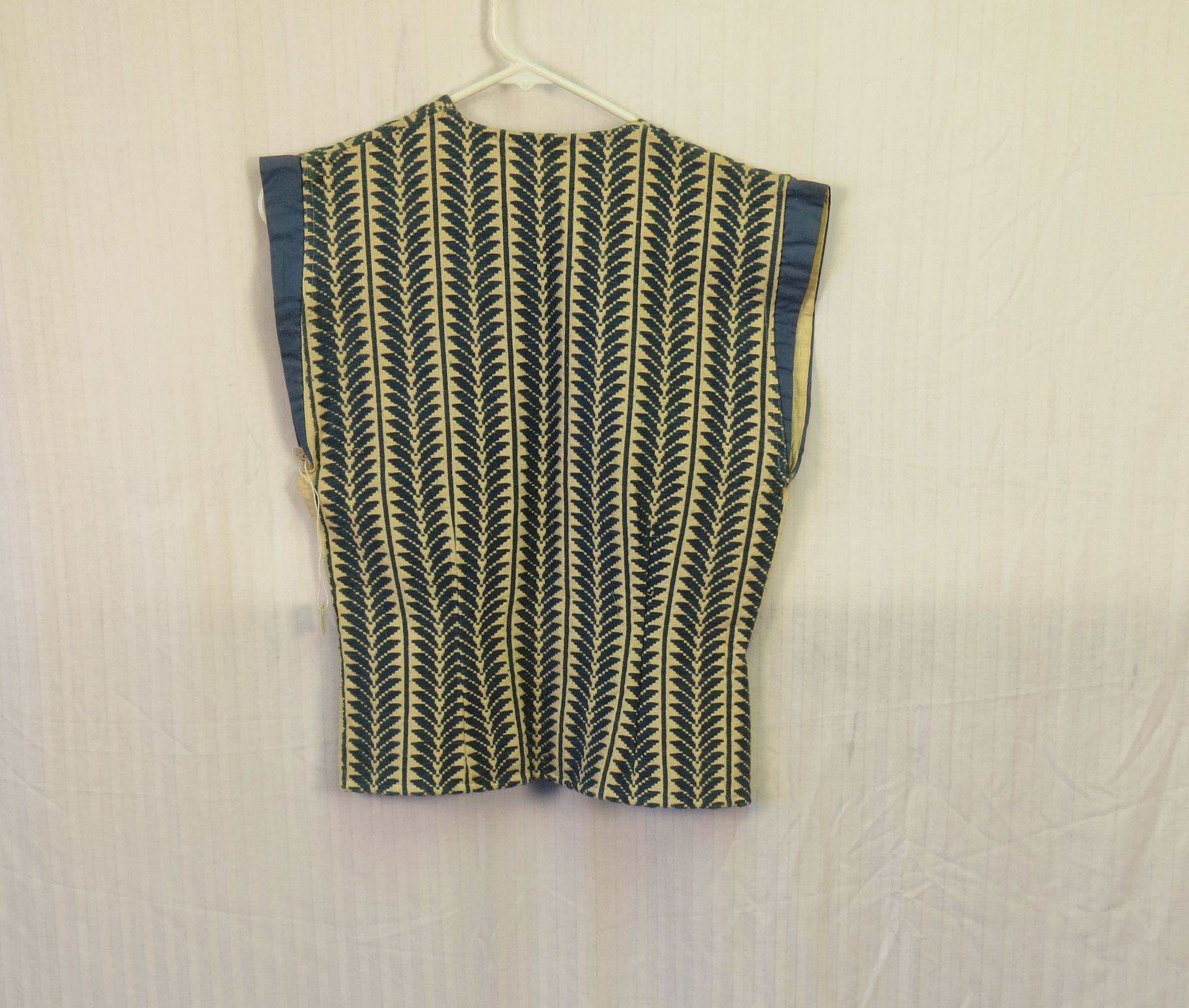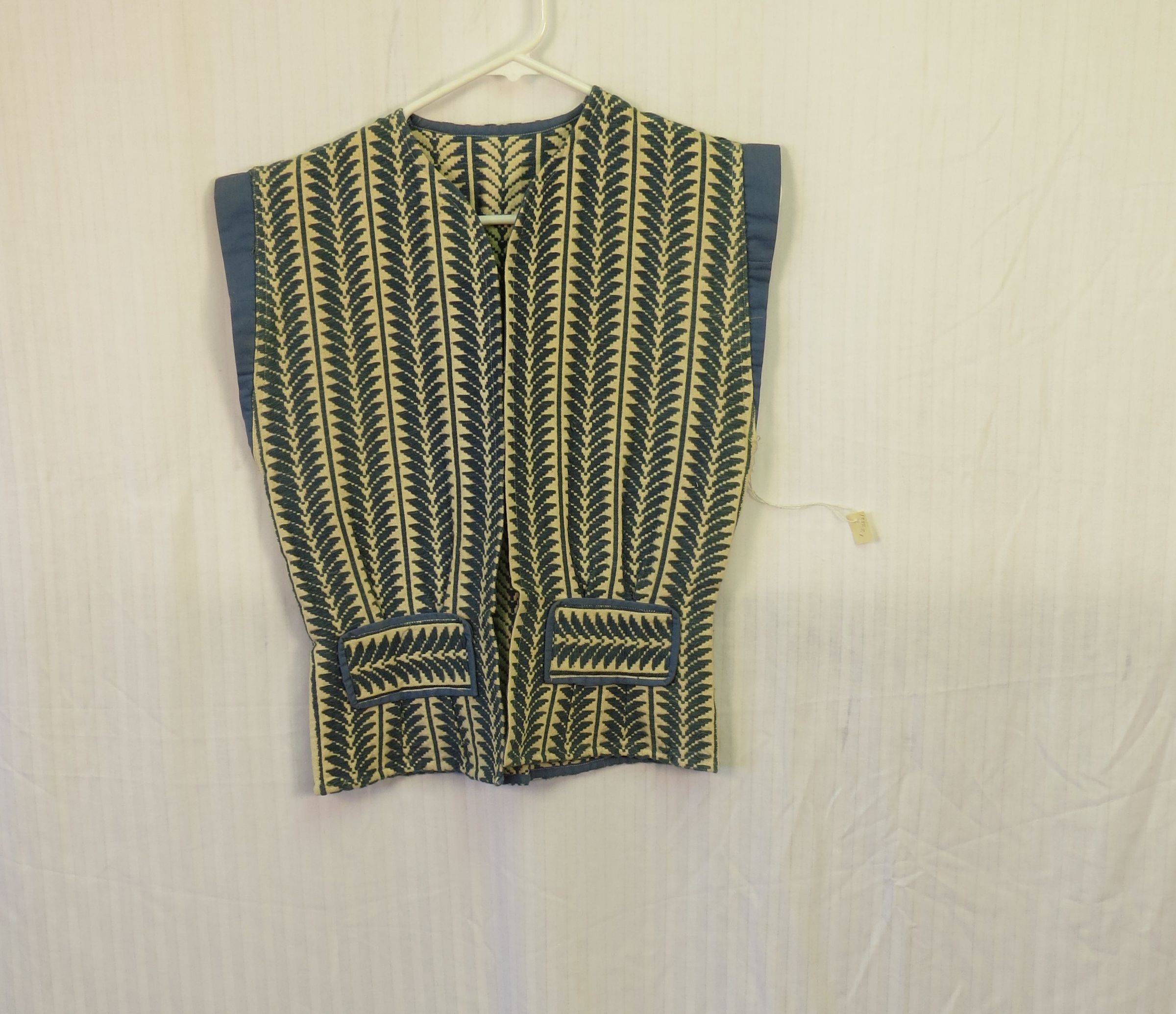 Fitted vest with blue embroidery on light tan colored background. The embroidery is in long strips down front with cascading v shapes. There is additional blue material around the arm opening. Two small self-fabric pockets at front where slight gathering occurs through the mid-section. The vest measures 17" (w) x 21" (l).Collection