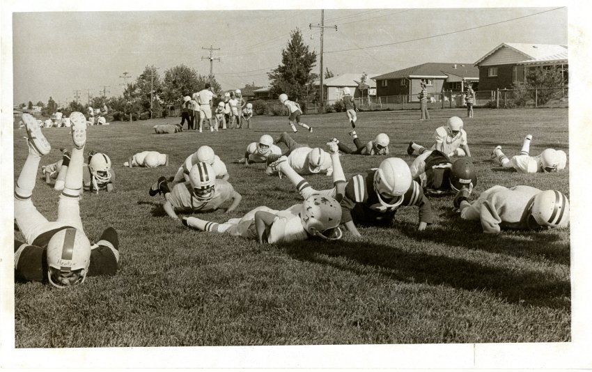 Groups of young boys practice and perform drills for first day of football in Broomfield at Midway Park